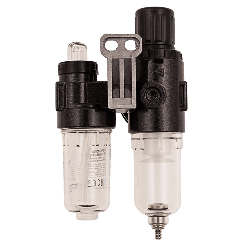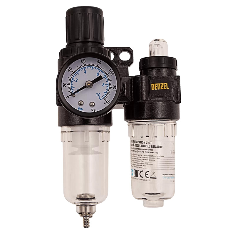 Блок подготовки воздуха регулятор-фильтр-лубрикатор FLR1500, 10 бар, 1500 л/мин, 1/4 Denzel 57469 с максимальной пропускной способностью 1500 л/мин, присоединительным размером 1/4 дюйма, предназначен для работы под давлением не более 10 бар. Используется для очистки сжатого воздуха от воды и вредных примесей, твердых частиц размером до 40 мкм, для подачи в воздух смазки для пневмоинструмента. Позволяет регулировать и поддерживать на заданном уровне давление в пневматических устройствах различного назначения. Устройство значительно увеличивает срок службы пневмоинструмента. Вместимость фильтра составляет 15 мл, лубрикатора — 25 мл.