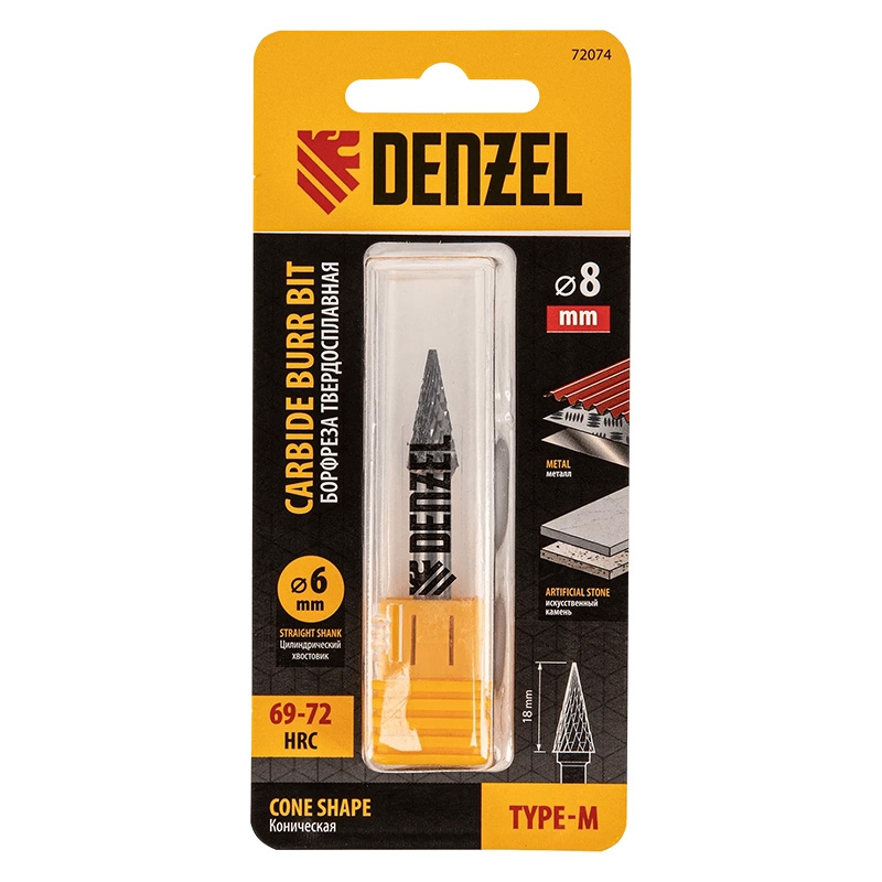 Твердосплавная борфреза по металлу Denzel 72074 с конической рабочей частью (тип M), диаметром 8 мм, — оснастка для дрели и прямошлифовальной машины. Позволяет снимать фаски и удалять заусенцы, идеальна для обработки поверхностей сложной формы, конических отверстий и пазов, а также выполнения точных работ. Подходит для шлифовки деталей из закаленной и нержавеющей стали, чугуна, бронзы, меди, латуни, титана, а также металлокерамики и искусственного камня.