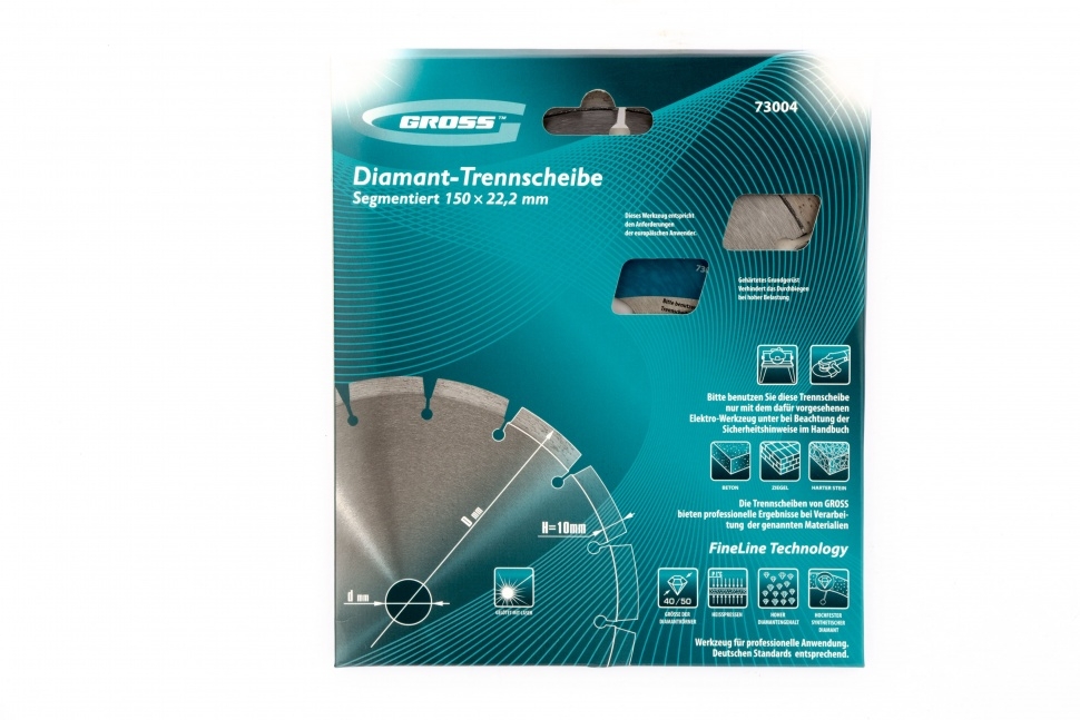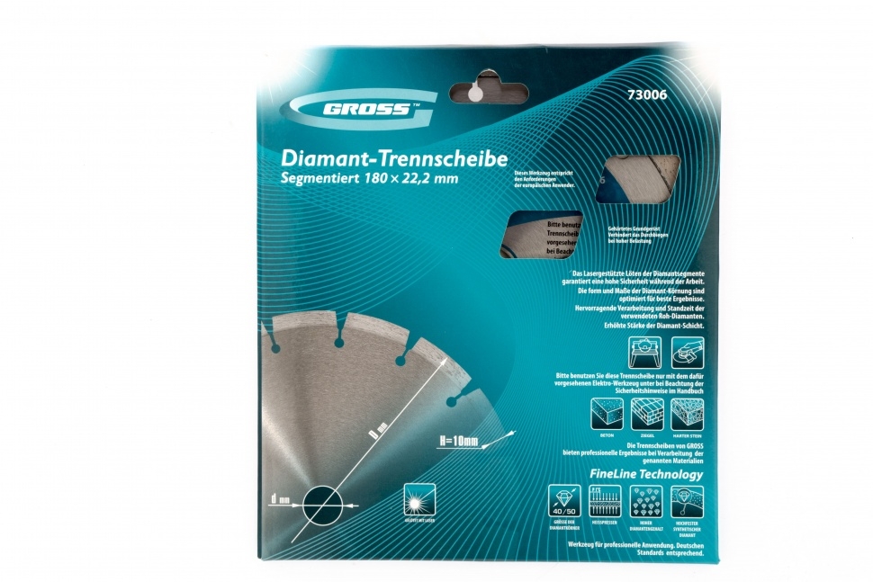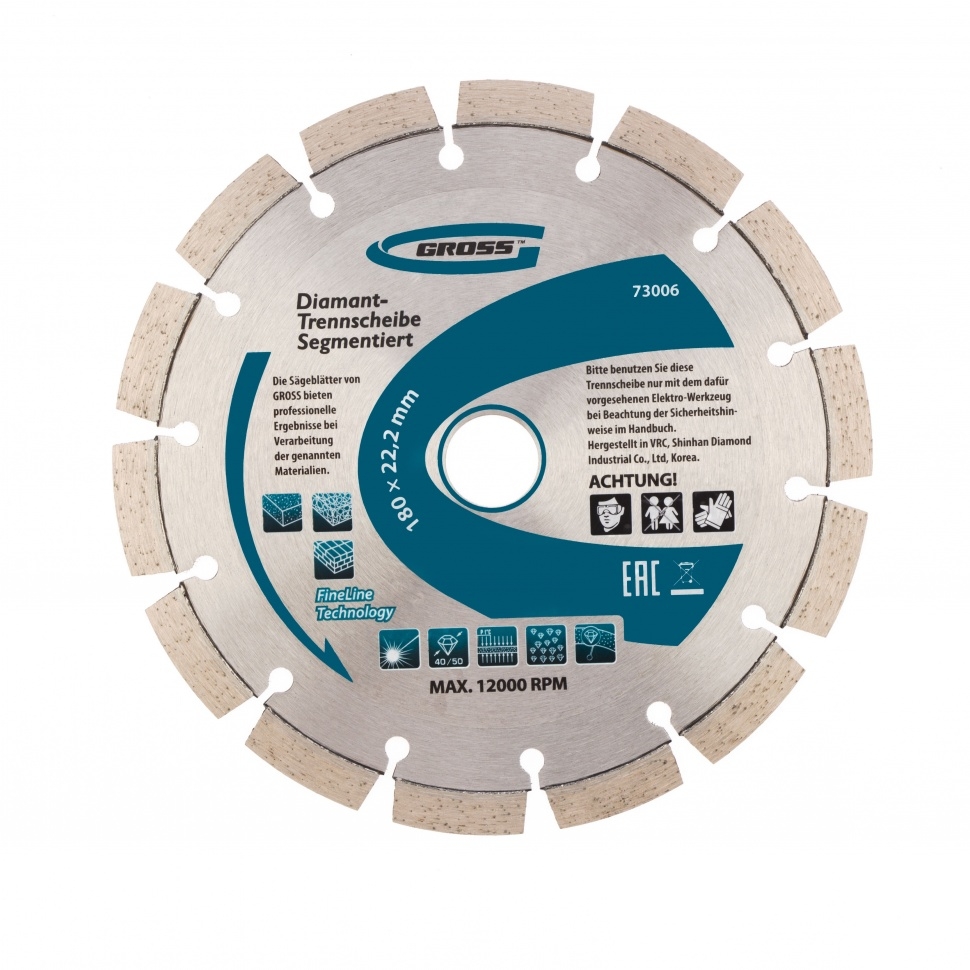 Алмазный диск Gross ф180х22,2 мм 73006 с лазерной приваркой сегментов предназначен для сухого резания бетона, в том числе свежего, кирпича, песчаника и гранита. Посадочный диаметр 22,2 мм позволяет использовать диск в качестве расходного инструмента для УШМ. Сегменты обеспечивают быстрое сухое резание без необходимости водяного охлаждения. За счет оптимально подобранной связки диск выдерживает перегрузки и подходит как для интенсивного бытового, так и для профессионального применения, когда требуется выполнить большой объем работ.Преимущества Сегментная форма &mdash 14 прорезей в режущем слое способствуют небольшому изменению размера секторов диска в процессе сухого резания, что позволяет защитить его от деформации. Лазерная приварка сегментов &mdash режущий алмазный слой прочно фиксируются на корпусе, такая технология изготовления гарантирует надежность диска и высокую стойкость к нагрузкам. Ширина алмазного слоя 10 мм &mdash диск гарантирует высокую производительность выполняемых работ. Высокая концентрация
