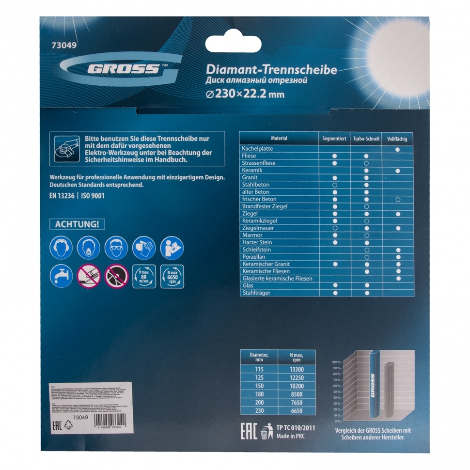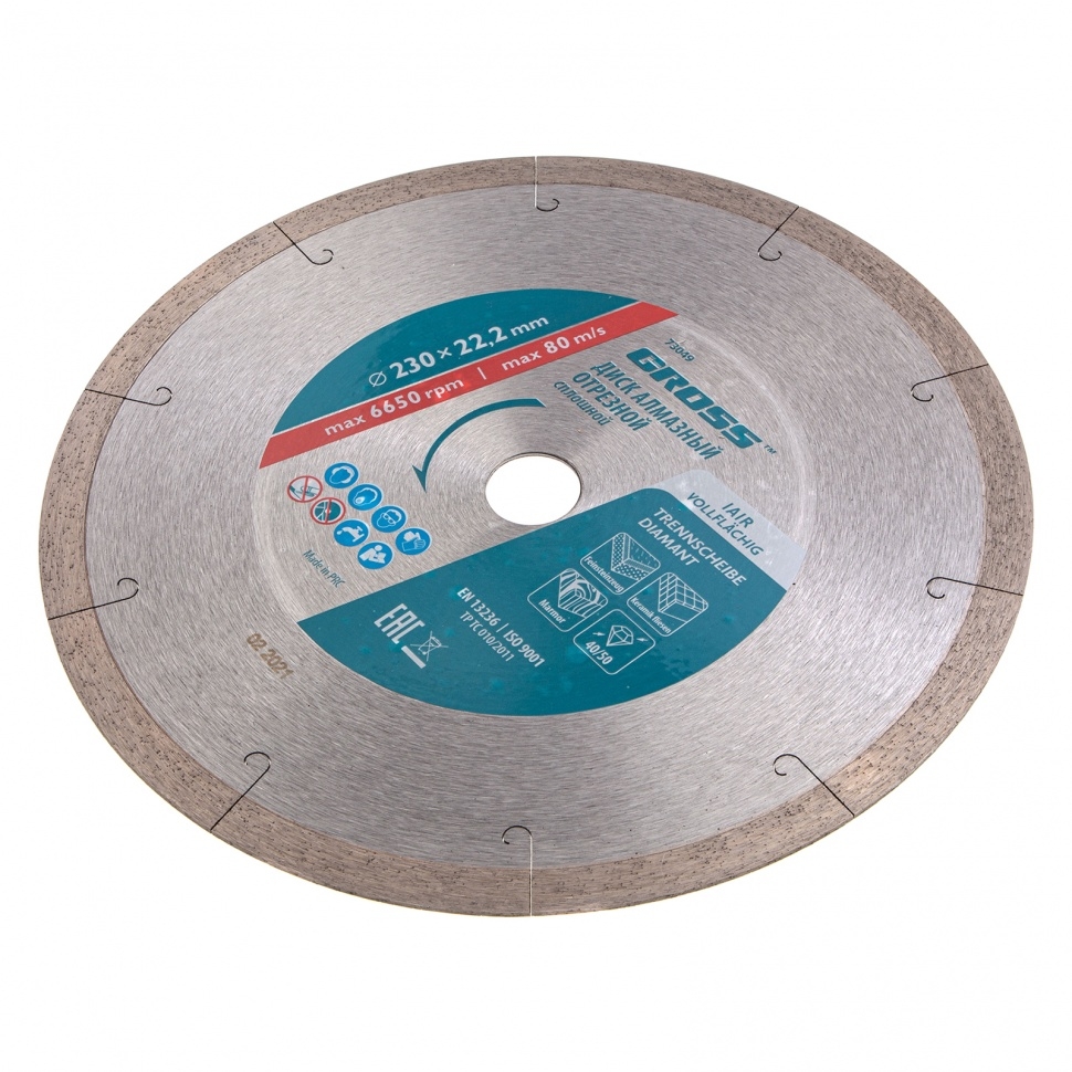 Сплошной алмазный диск Gross ф230х22,2 мм 73049 с лазерной перфорацией для мокрого резания используется в качестве расходника на УШМ или плиткорезах с посадочным размером 22,2 мм. Оптимальное соотношение серебра, кобальта и других качественных компонентов в металлической связке позволяет работать с гранитом, керамикой, керамогранитом, мрамором, натуральным и искусственным камнем. Метод мокрого шлифования подразумевает использование водяного охлаждения, что способствует снижению перегрева и эффективному отводу пыли.Преимущества Диск имеет большой ресурс, надежность и может использоваться профессионально, т.к. изготовлен по технологии горячего прессования. За счет сплошного типа диска обеспечивается качественный ровный срез без риска образования сколов. Высокая концентрация и крупный размер алмазов 40-50 мкм повышают скорость реза. Лазерная перфорация усиливает охлаждение диска, а значит, он легко выдерживает интенсивное использование. Режущая часть шириной 10 мм гарантирует стабильно высокую производительность