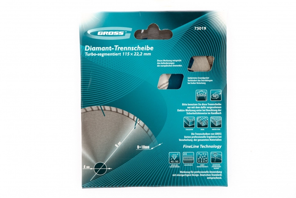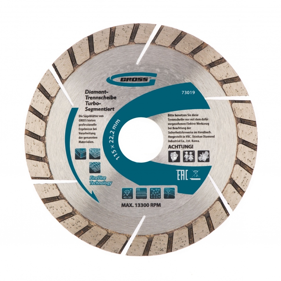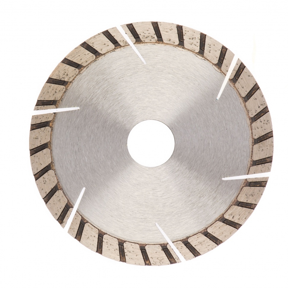 Алмазный турбо-сегментный диск Gross ф115х22,2 мм 73019 для сухого резания устанавливается на УШМ в качестве оснастки для проведения отрезных работ. Диск с турбированной рабочей частью универсален по своему применению и его можно использовать для резки камня, гранита и кирпича, свежего бетона, а также слабоармированного железобетона. Он пригодится для интенсивных работ с профессиональным инструментом.Преимущества Турбо-сегментная форма &mdash резание материалов происходит быстро, водяное охлаждение не требуется, в т.ч. армированного бетона. Надежность &mdash диск выполнен методом горячего прессования. Износостойкость и скорость реза до 13300 об/мин &mdash режущая часть выполнена из крупных алмазов размером 40-50 мкм. Рабочая часть 10 мм с высокой концентрацией алмазных зерен &mdash диск идеально подходит для выполнения больших объемов работ. Оптимально подобранная металлическая связка &mdash серебро, кобальт и другие составляющие значительно повышают ресурс диска, позволяют резать материалы разной плотности б