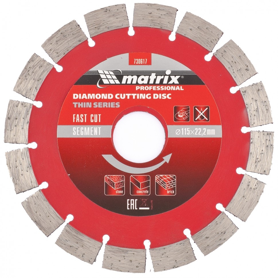 Отрезной сегментный алмазный диск Matrix ф115х22,2 мм 730617, тонкий, позволяет проводить сухое резание свежего и старого бетона, камня, гранита, шлакоблока, тротуарной плитки, песчаника и кирпича с помощью УШМ. Его можно использовать как в частной мастерской, так и на стройке для решения профессиональных задач. Тонкий корпус диска способствует снижению нагрузки на инструмент, позволяя ускорить рабочий процесс на 20%.Преимущества 16 сегментов позволяют быстро проводить работы по различным материалам без водяного охлаждения диска. За счет ширины режущего слоя 10 мм и высокой концентрации алмазов диск быстро разрезает материалы без риска преждевременного износа. Плотная металлическая связка отлично удерживает алмазы, обеспечивая их равномерное истирание, своевременную раскрываемость и полную выработку. Технология ускоренного горячего прессования делает диск устойчивым к высоким нагрузкам и износу.