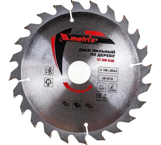 Пильный диск по дереву Matrix ф190 х 30 мм 73217 с 24 зубьями применяется в качестве оснастки на циркулярных и торцовочных пилах с соответствующим внутренним и внешним диаметром. Он используется для продольного/поперечного реза материалов из мягкой и твердой древесины, ДСП, ДВП, фанеры, столярных плит.