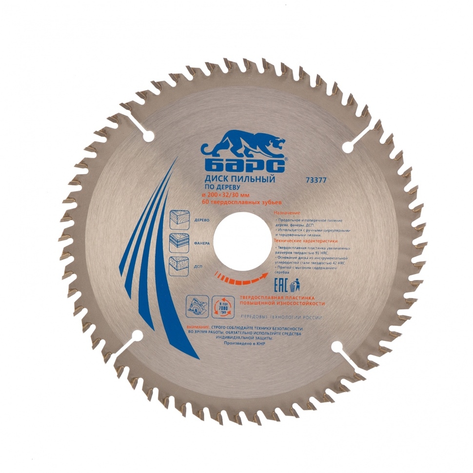 Пильный диск Барс 73377, ф200 х 32 мм, с 60 зубьями и кольцом 32/30 мм предназначен для точного и чистого пиления древесины мягких и твердых пород, ДСП, МДФ и фанеры. Мелкие зубья типа АТВ и оптимально подобранный угол зуба позволяют производить качественный поперечный распил. Диск используется совместно с торцовочными и циркулярными пилами с посадкой 32 мм. В комплект входит переходное кольцо на диаметр 30 мм, расширяющее возможности применения оснастки. Диск подходит для интенсивной эксплуатации и может использоваться в профессиональной сфере. Повышенная износостойкость - пластины изготовлены из сплава YG8 твердостью свыше 88 HRА с добавлением легирующих компонентов, формирующих мелкозернистую структуру материала.