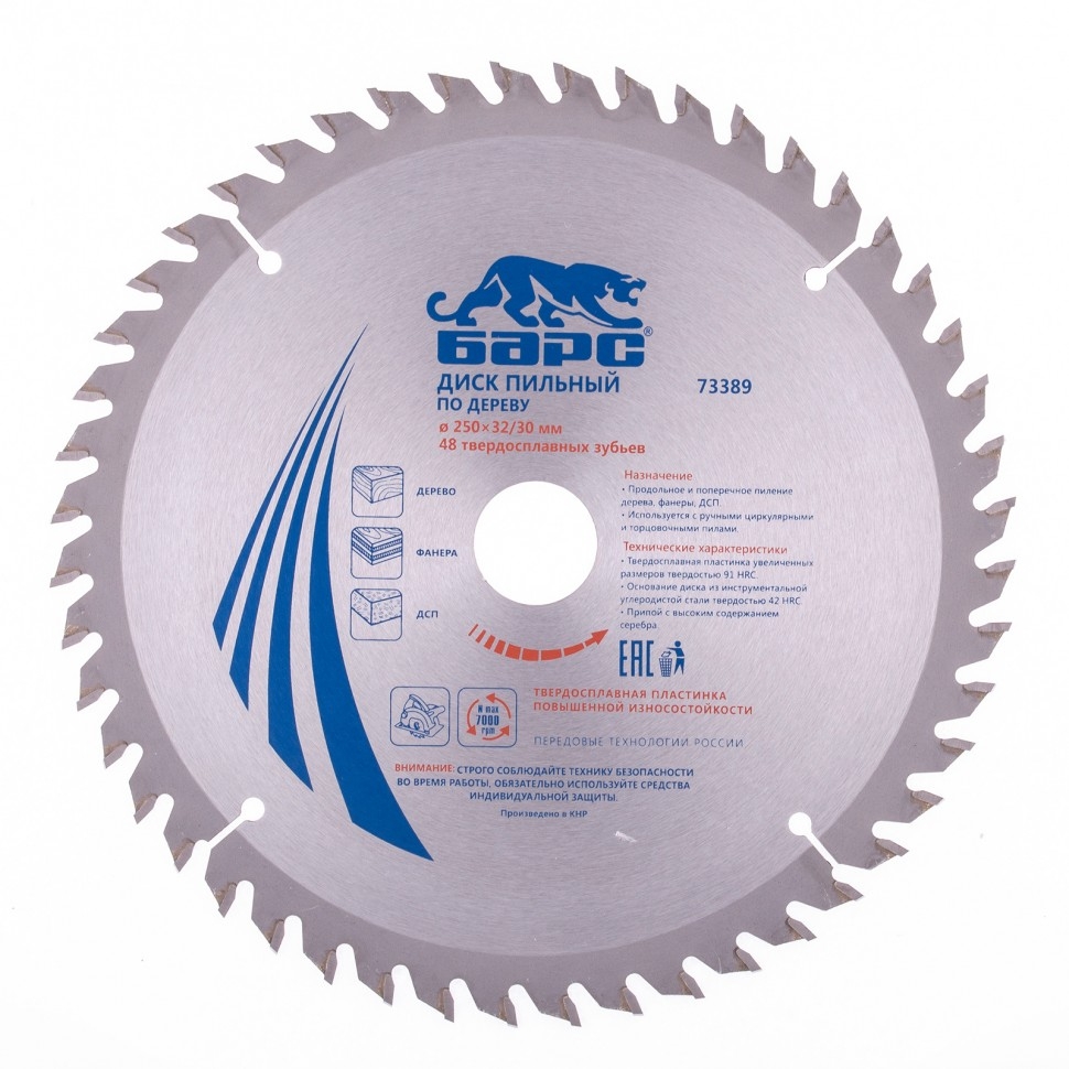 Пильный диск Барс 73389, ф250 х 32 мм, с 48 зубьями и кольцом 32/30 мм предназначен для оптимального по скорости и качеству пиления древесины мягких и твердых пород, ДСП, МДФ и фанеры. Мелкие зубья типа АТВ и оптимально подобранный угол зуба позволяют производить качественный поперечный распил. Диск используется совместно с торцовочными и циркулярными пилами с посадкой 32 мм. В комплект входит переходное кольцо на диаметр 30 мм, расширяющее возможности применения оснастки. Диск подходит для интенсивной эксплуатации и может использоваться в профессиональной сфере. Повышенная износостойкость - пластины изготовлены из сплава YG8 твердостью свыше 88 HRА с добавлением легирующих компонентов, формирующих мелкозернистую структуру материала.