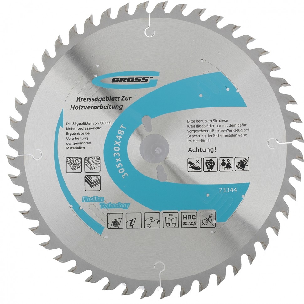 Пильный диск Gross 73344, ф305 х 30 мм, с 48 зубьями, предназначен для распила древесины мягких и твердых пород, ДСП, МДФ и фанеры. Является оснасткой для циркулярных и торцовочных пил с посадочным диаметром 30 мм, благодаря универсальному типу зубьев АТВ подходит преимущественно для поперечного реза материалов. Диск изготовлен на высококачественном оборудовании, специально рассчитан на профессиональное применение и выполнение большого объема работ. Преимущества 48 мелких зубьев обеспечивают точный и чистый рез материалов. Режущие пластины изготовлены из сплава К10 со специальными добавками Ceratizit твердостью 91 HRА, что гарантирует их износостойкость и максимальный рабочий ресурс. В припое содержится значительное количество серебра, он надежно фиксирует твердосплавные пластины к корпусу диска. Режущие кромки прошли многоступенчатую автоматическую заточку, обеспечивающую высокое качество пиления. Корпус изготовлен из инструментальной стали 65Mn и термообработан, поэтому обладает устойчивостью к динамическ