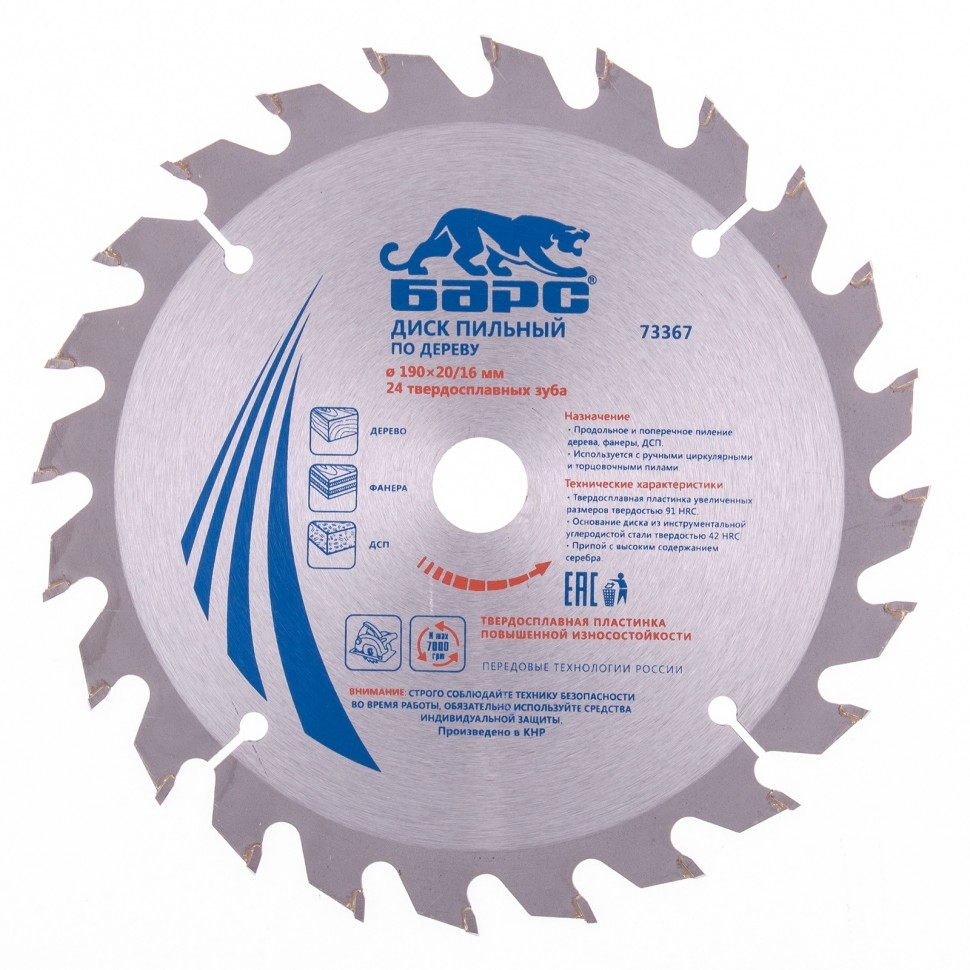 Пильный диск Барс 73367, ф190 х 20 мм, с 24 зубьями и кольцом 20/16 мм предназначен для быстрого пиления древесины мягких и твердых пород, ДСП, МДФ и фанеры. Тип зубьев АТВ и оптимально подобранный угол зуба позволяют производить как продольный, так и поперечный распил. Диск используется совместно с торцовочными и циркулярными пилами с посадкой 20 мм. В комплект входит переходное кольцо на диаметр 16 мм, расширяющее возможности применения оснастки. Диск подходит для интенсивной эксплуатации и может использоваться в профессиональной сфере. Повышенная износостойкость - пластины изготовлены из сплава YG8 твердостью свыше 88 HRА с добавлением легирующих компонентов, формирующих мелкозернистую структуру материала.