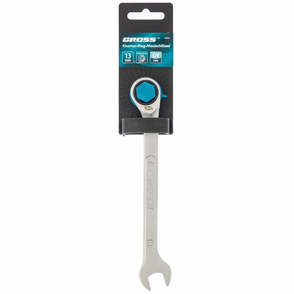 Комбинированный трещоточный ключ Gross 14851, 13 мм, используется при монтаже и демонтаже резьбовых соединений. Инструмент имеет как рожковую, так и накидную часть, что повышает его функциональность. У накидной части 12 внутренних граней, что увеличивает площадь соприкосновения с головкой крепежа и снижает риск ее деформации. Ключ применяется как в автосервисах, так и для самостоятельного ремонта автомобилей.