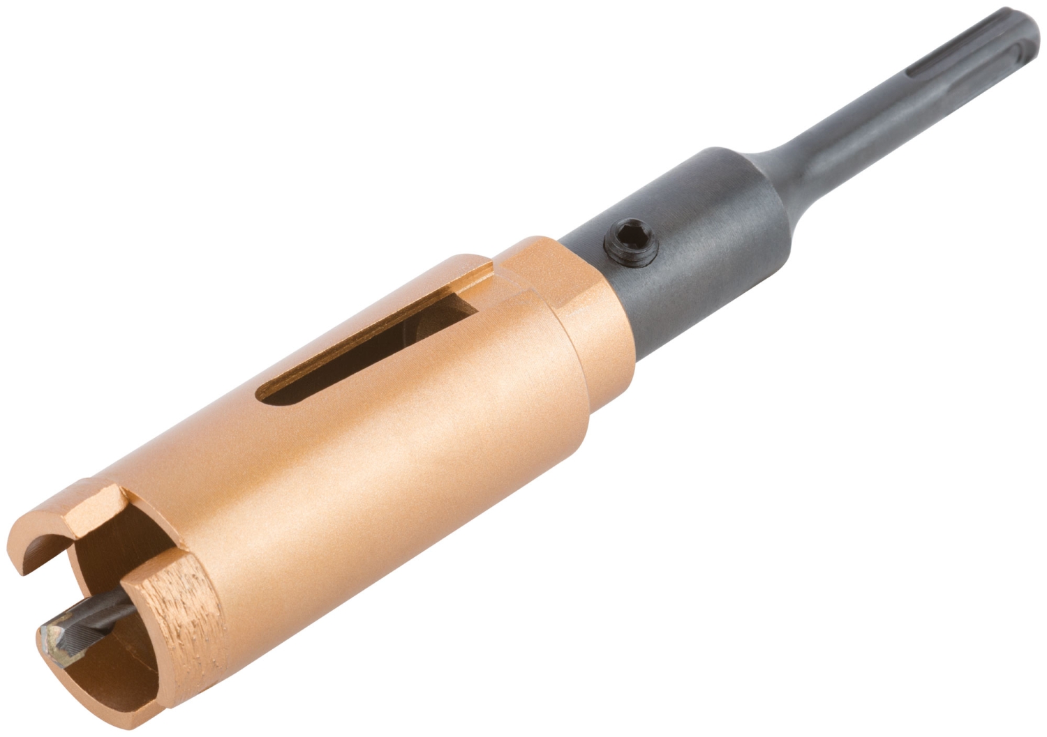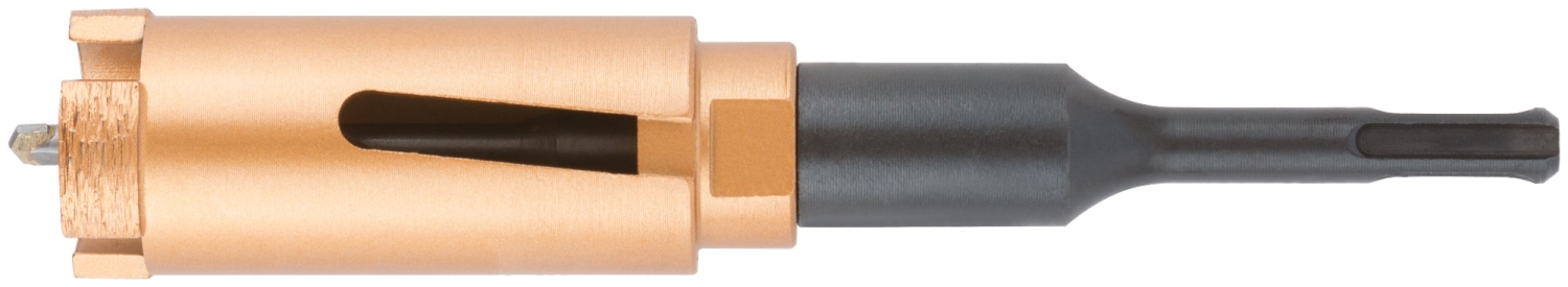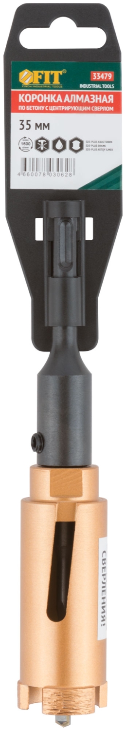 Коронка алмазная с центрирующим сверлом и хвостовиком SDS-PLUS. Для безударного сверления отверстий под монтажные коробки в бетоне и кирпиче. Для работы с водяным охлаждением. Материал: корпус из инструментальной стали, хвостовик и центрирующее сверло из легированной стали, режущая кромка содержит порошок из технических алмазов. Упаковка: пластиковый подвес.
