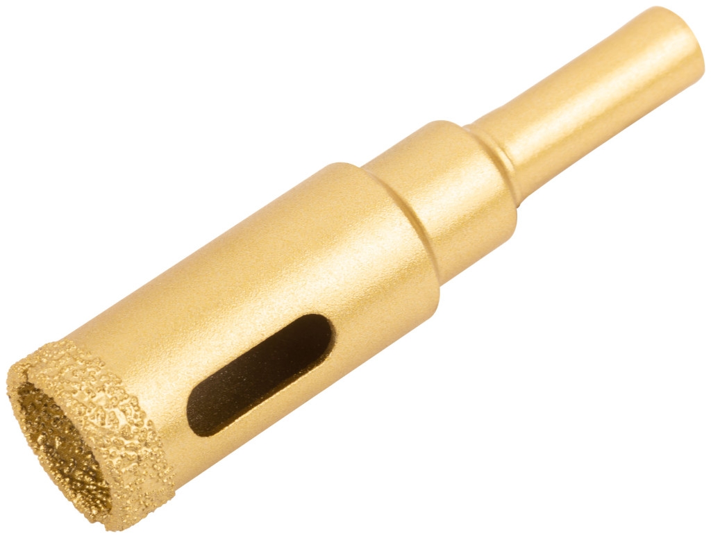 Профи. 16301-16306: цилиндрический хвостовик, 16308-16310: трехгранный хвостовик. Для вырезания круговых отверстий в керамограните, кафельной плитке, бетоне, граните, мраморе, камне, кирпиче и стекле. Влажное сверление. Глубина пропила 35 мм. Материал: инструментальная сталь, режущая кромка содержит порошок из технических алмазов. Упаковка: блистер. Предназначена для вырезания круглых отверстий в керамограните, камне, стекле, кафельной плитке. Влажное сверление. Глубина пропила — 35 мм. Высокая концентрация алмазного зерна обеспечивает износостойкость и длительный ресурс коронок. Чистый рез без сколов достигается за счет мелкого размера алмазных частиц. Отверстия в корпусе коронок способствуют эффективному охлаждению и отводу шлама. Цилиндрический хвостовик совместим с большинством патронов электроинструмента.