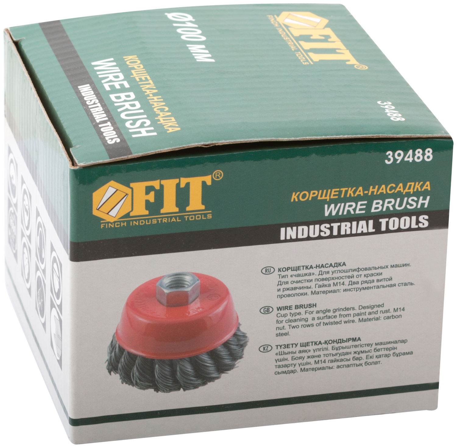 Тип «Чашка», гайка М14. Для УШМ. Два ряда стальной витой проволоки. Материал: инструментальная сталь. Упаковка: картонная коробка. Корщетка-чашка FIT IT 39488 используется для шлифовальных и обдирочных работ в угловых шлифовальных машинах. Оснастка крепится к инструменту при помощи гайки М14. Рабочая поверхность щетки — витая стальная проволока.