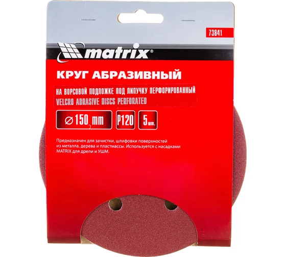 Абразивный круг на ворсовой подложке под «липучку» Matrix Р120 арт. 73841 используется для сухого чистового шлифования металла, дерева, пластика и других поверхностей. Круг устанавливается на эксцентриковые (орбитальные) шлифовальные машинки с отводом воздуха или на дрель с помощью опорной насадки Matrix. Среднезернистый абразив Р120 средней зернистости придает гладкость поверхностям, устраняет дефекты, подготавливая их к последующей отделке.