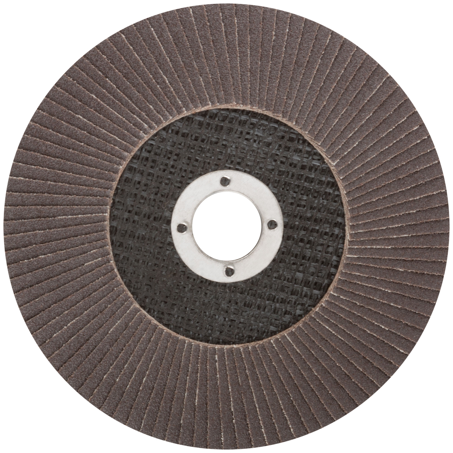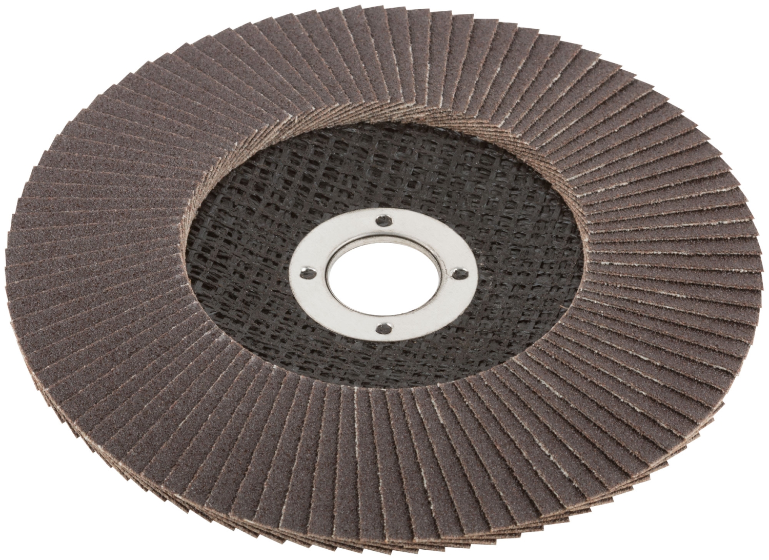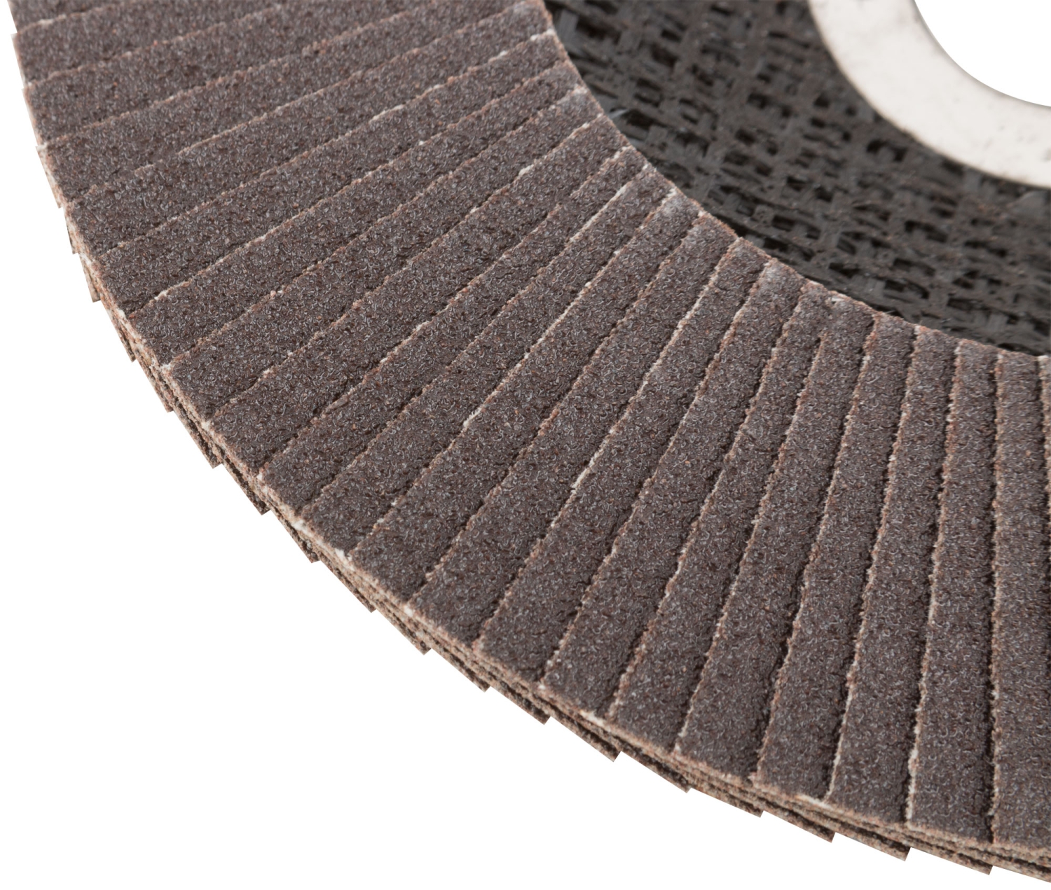 При изготовлении используется высококачественный гибкий абразивный материал состоящий из тканевой основы на которую нанесен слой кальцинированного оксида алюминия. Данный абразив имеет более твердые частицы,чем обычный оксид алюминия - Корунд, что позволяет увеличить скорость обрабатываемой поверхности до пяти раз. Наполняемость диска составляет до 96 лепестков с углом наклона 10 градусов, что позволяет увеличить КПД круга и его стойкость к износу в несколько раз. Предназначен для обработки металла и нержавеющей стали.<br/>Для углошлифовальных машин. Посадочный диаметр 22,2 мм.