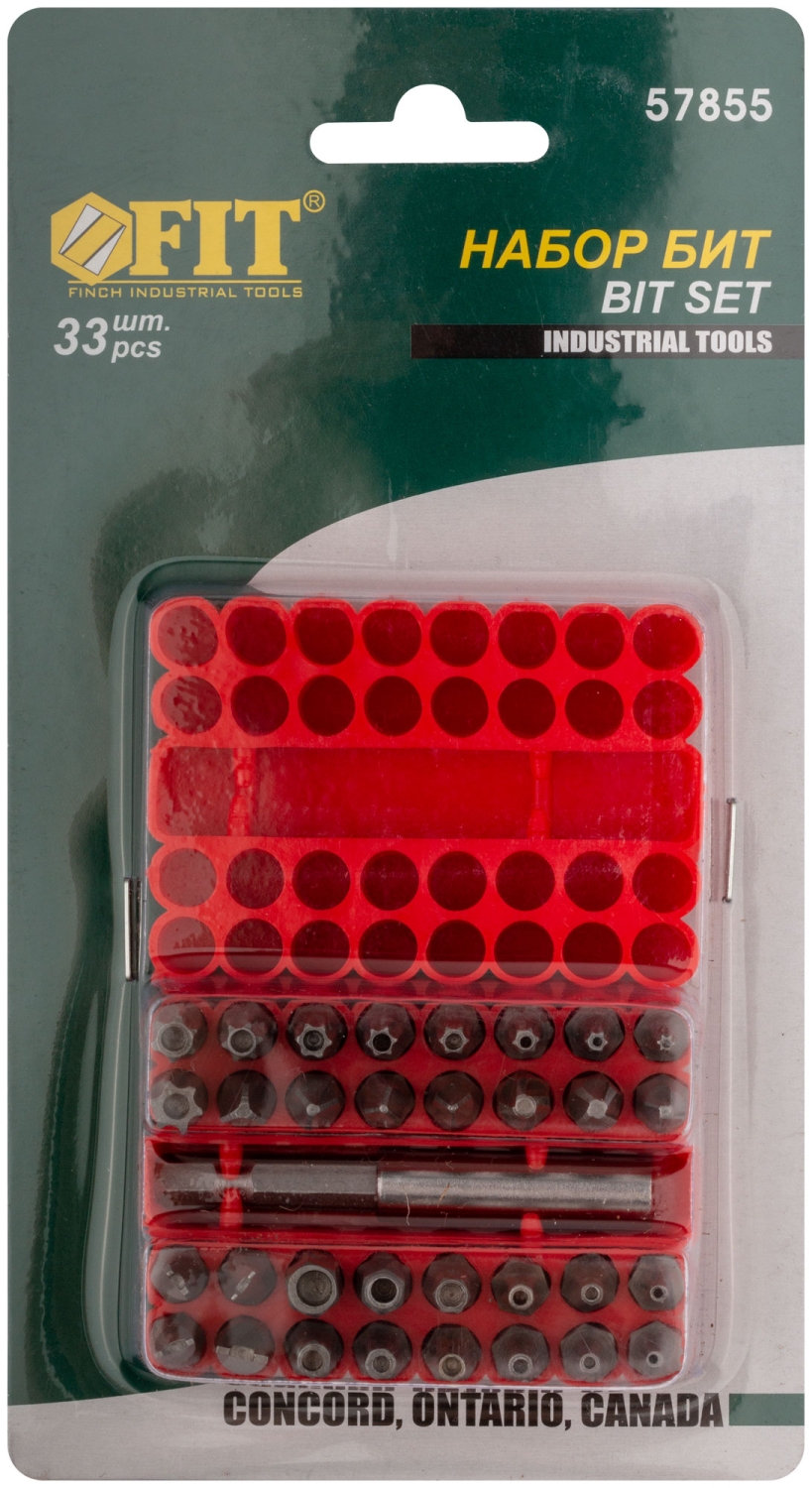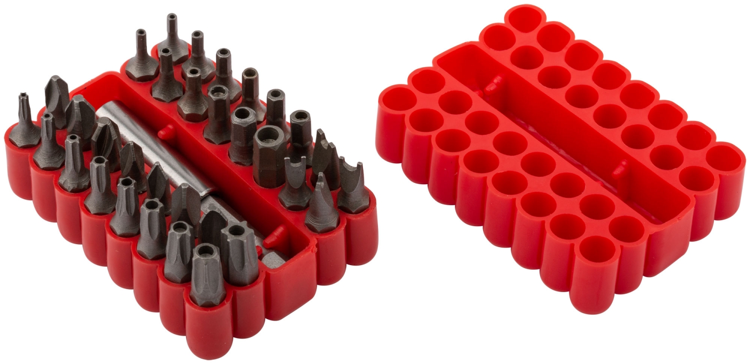 В пластиковом корпусе. В наборе 32 бит из хром-ванадиевой стали, удлинитель (L=50 мм). Биты: H2, H2.5, H3, H4, H6, H5/64, H3/32, H7/64, H1/8, H9/64, H5/32, SL4, SL6, SL8, SL10, T8, T10, T15, T20, T25, T27, T30, T35, T40, X6, X8, X10, Y1, Y2, Y3, Y4. Упаковка: блистер.