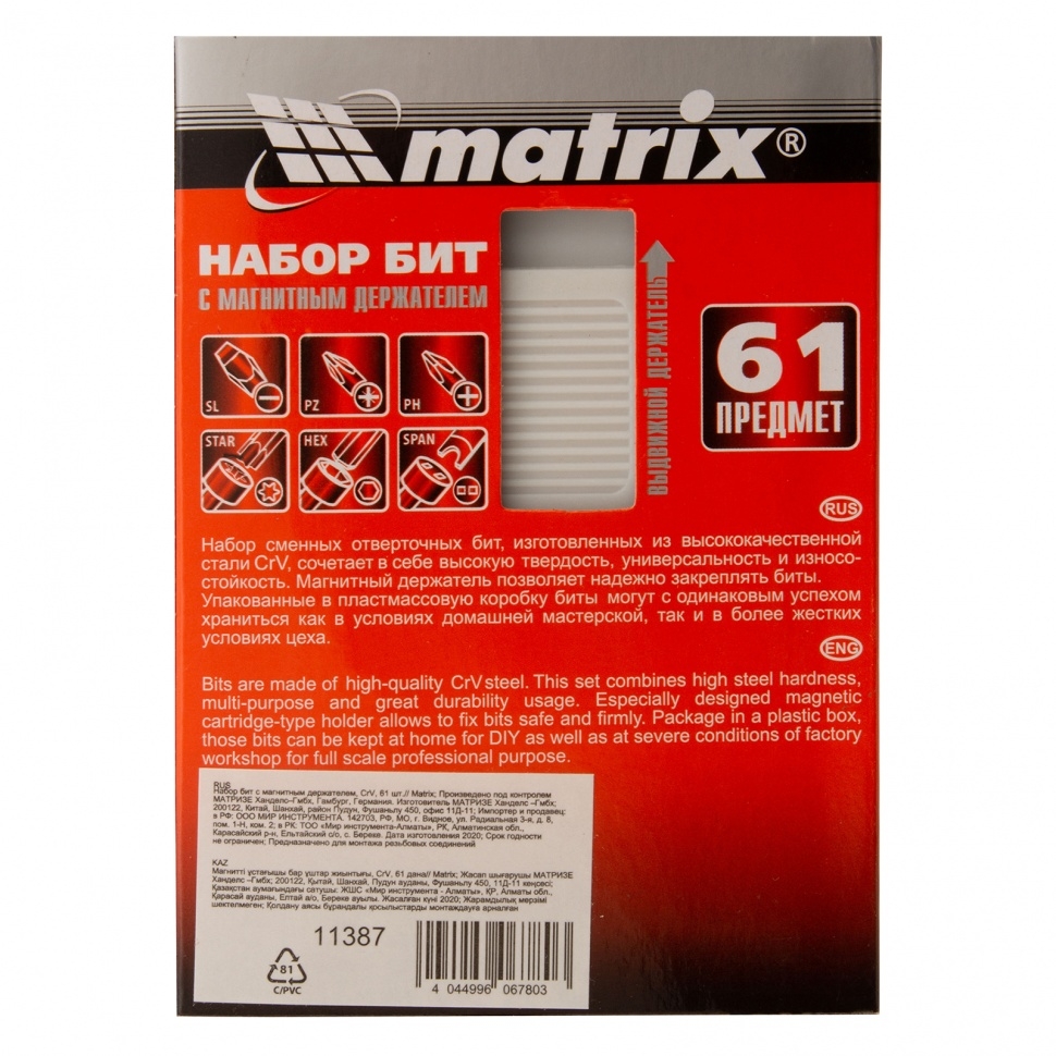 Набор бит с магнитным держателем CrV, 61шт. Matrix