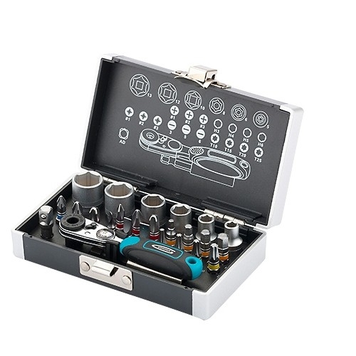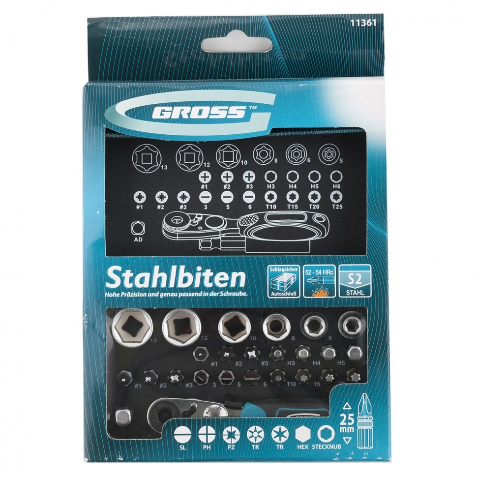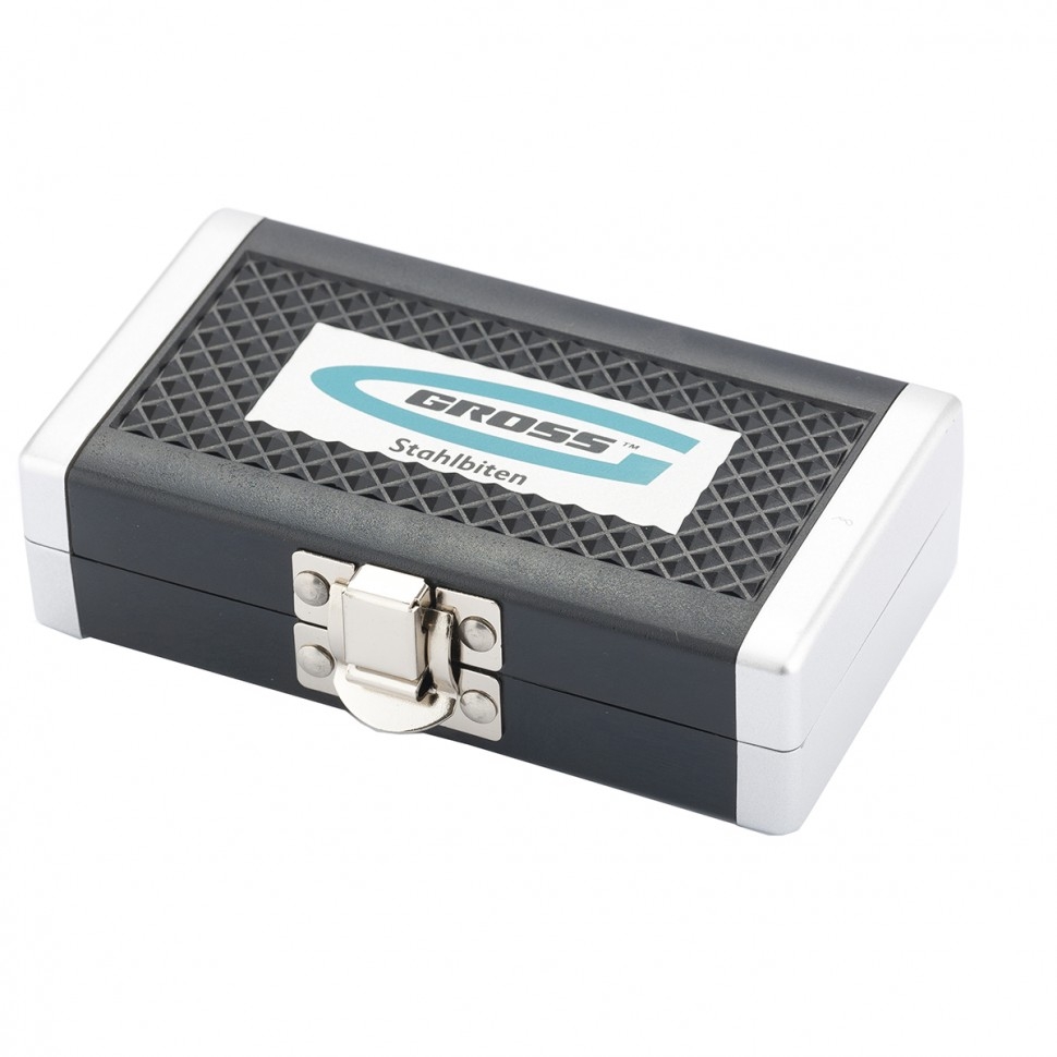 Набор бит и торцевых головок Gross 11361 из стали S2, с посадочным размером 1/4 дюйма, с магнитным адаптером, в пластиковом кейсе, включает в себя 26 предметов для монтажа и демонтажа резьбовых соединений. Применяется при сборке мебели, электроприборов, велосипедов. В комплект входит 17 бит и 6 торцевых головок самых востребованных размеров, миниатюрный ключ-трещотка, удлинитель для бит и переходник с шестигранника на квадрат. Широкая комплектация — набор включает биты Phillips калибров 1-3, Pozidriv калибров 1-3, прямой шлиц SL калибров 3, 5, 6, TORX 10, 15, 20, 25, HEX 3-6 и торцевые головки на 1/4 размерами 5, 6, 8, 10, 12, 13 мм. Высокий ресурс — биты из японской легированной стали S2 твердостью 52-54 HRC и торцевые головки из хромованадиевой стали твердостью 48 HRC обладают повышенной прочностью, износостойкостью и рассчитаны на долгую службу. Работа в труднодоступных местах — компактная трещотка с 52 зубьями особенно актуальна в ограниченном пространстве, где невозможно работать шуруповертом.