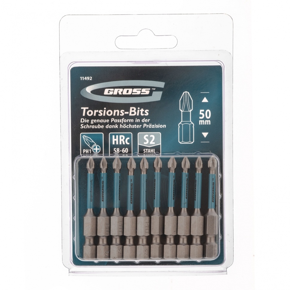 Торсионные биты PH1x50 мм Gross арт. 11492 предназначены для монтажа и демонтажа резьбовых соединений с помощью ударного шуруповерта. Они незаменим в строительных, слесарных и монтажных работах, в автосервисах, при проведении ремонта в доме и т.д. Торсионная зона способна пружинить, за счет чего она частично амортизирует тангенциальный удар от шуруповерта. Такое решение позволяет равномерно распределить нагрузку по бите и избежать поломки шлица. Торсионная зона позволяет работать ударным шуруповертом даже с особо твердыми поверхностями без риска поломки бит. Высококачественный материал изготовления — японская легированная сталь S2 обеспечивает устойчивость бит к износу и увеличивает их ресурс. Закалка до твердости 58-60 HRC повысила прочность и сопротивляемость бит к деформации. Шлицы бит намагничены, поэтому крепеж не выпадет, а свободной рукой мастер сможет придерживать закрепляемый материал. Синее кольцо с логотипом ТМ Gross гарантирует защиту оснастки от подделок.