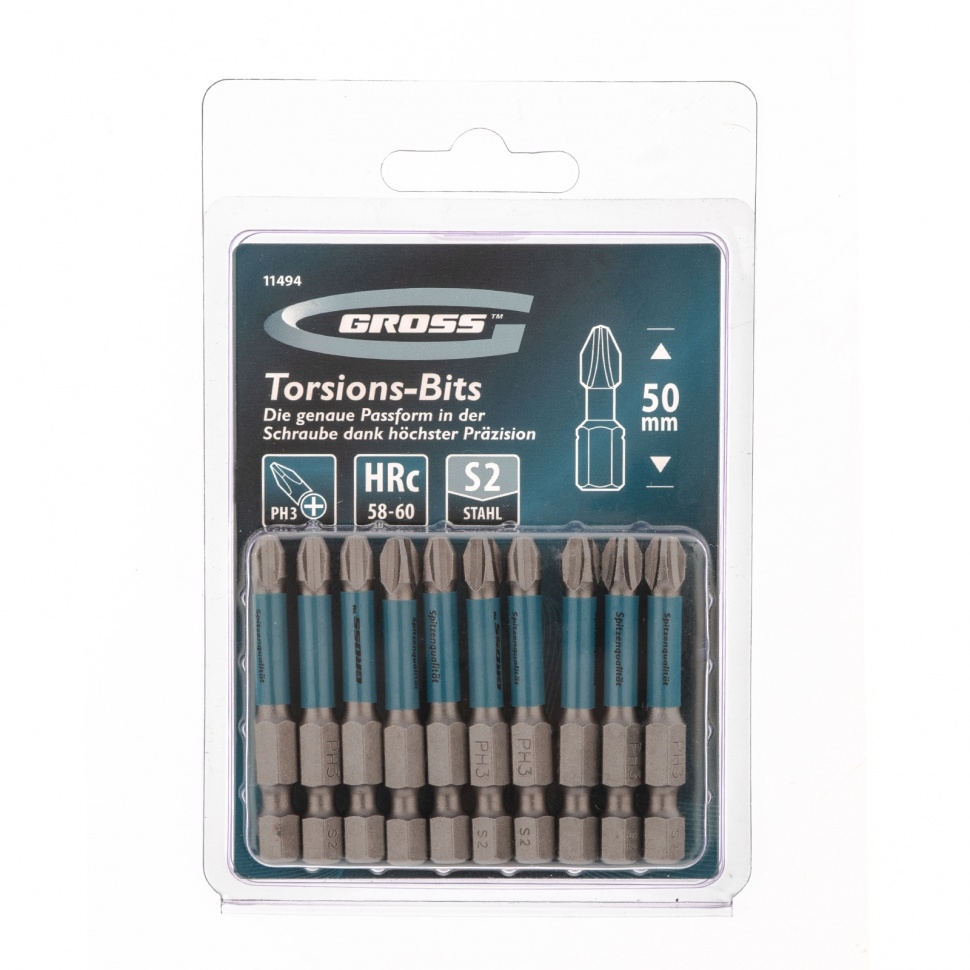 Набор торсионных бит PH3 x 50 мм Gross 11494, 10 шт., предназначен для монтажа и демонтажа резьбовых соединений с помощью ударного шуруповерта. Он незаменим в строительных, слесарных и монтажных работах, в автосервисах, при проведении ремонта в доме. Торсионная зона способна пружинить, за счет чего она частично амортизирует тангенциальный удар от шуруповерта. Такое решение позволяет равномерно распределить нагрузку по бите и избежать поломки шлица. Продуманная конструкция — торсионная зона позволяет работать ударным шуруповертом даже с особо твердыми поверхностями без риска поломки бит.