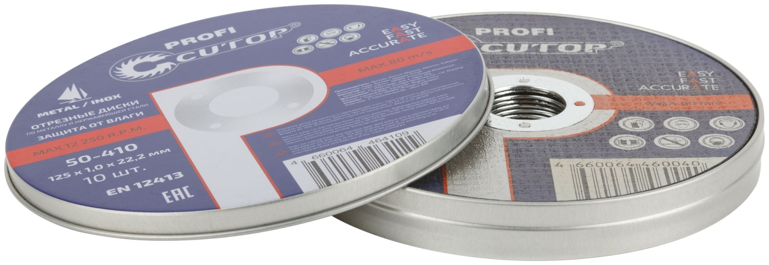 Комплект профессиональных отрезных дисков по металлу и нержавеющей стали, 10 штук. Металлическая коробка, защита от влаги. Диски на основе монокристалического электрокорунда, который улучшает КПД диска и позволяет увеличить количество резов в несколько раз. Для углошлифовальных машин. Посадочный диаметр 22.2 мм.