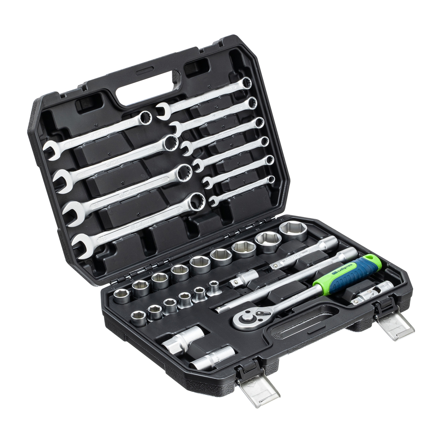 Набор инструментов Сибртех 13393, поставляющийся в пластиковом кейсе, состоит из 32 предметов с присоединительным размером 1/2", предназначенных для закручивания и откручивания резьбового крепежа. В комплект поставки входят 2 удлинителя и кардан, облегчающие работу в труднодоступных местах. Набор будет полезен для ремонта автомобиля в гараже, пригодится также и в быту.
