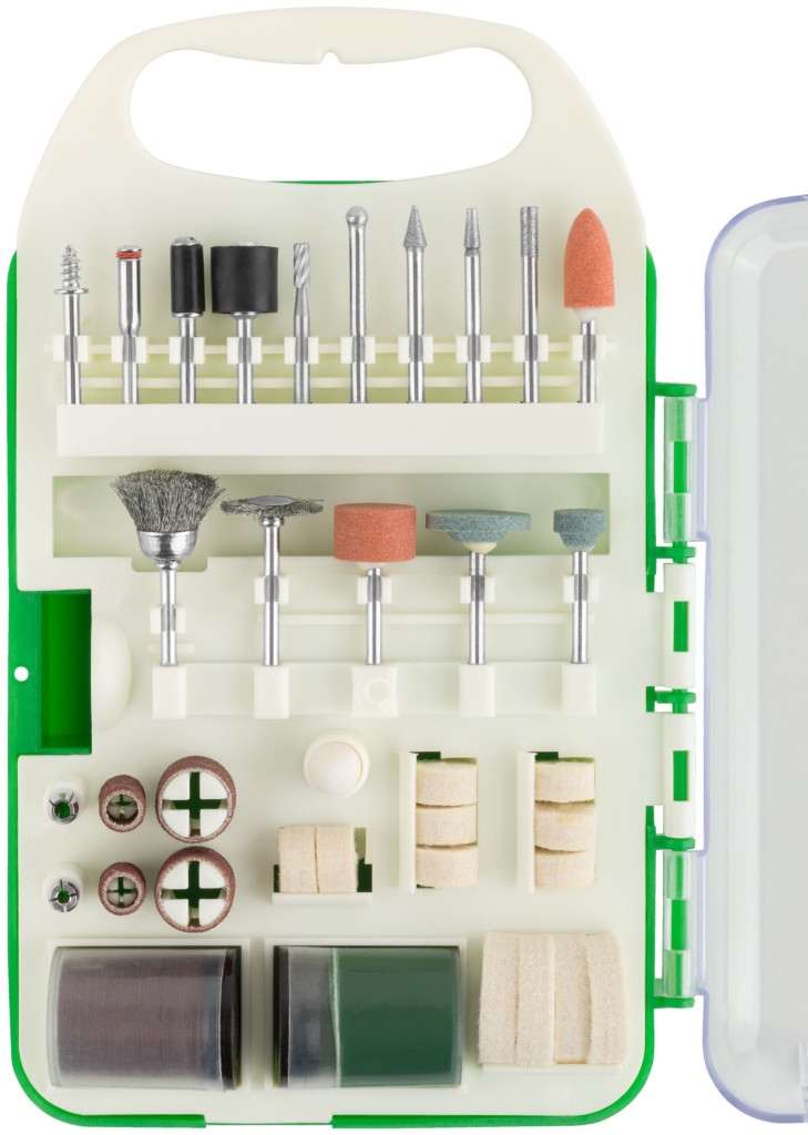 Для гравировальной машины. Для обработки различных материалов. В наборе: трубки наждачные, круги войлочные, шарошки алмазные, шарошки-мини по металлу, корщетки стальные, круги отрезные абразивные, патроны цанговые, паста полировальная, держатели для полировальных насадок и наждачных трубок. Упаковка: пластиковый кейс.