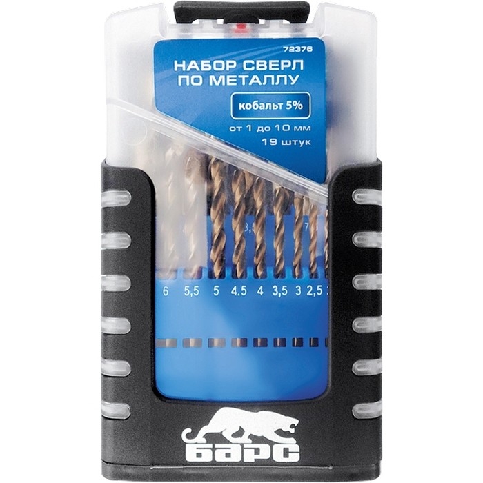 Набор Барс 72376 включает 19 сверл по металлу диаметром 1-10 мм (через 0,5 мм), из стали P6M5K5, с вышлифованным профилем и цилиндрическим хвостовиком, в боксе. Их используют для сверления отверстий в легированных, цветных и тяжелых металлах. В комплекте оснастки самых ходовых размеров, которые будут полезны во время слесарных работ, а также пригодятся дома, на даче или в гараже. Сверла изготовлены из быстрорежущей стали, содержащей вольфрам, молибден и кобальт, поэтому обладают высочайшей устойчивостью к перегреву и динамическим нагрузкам,