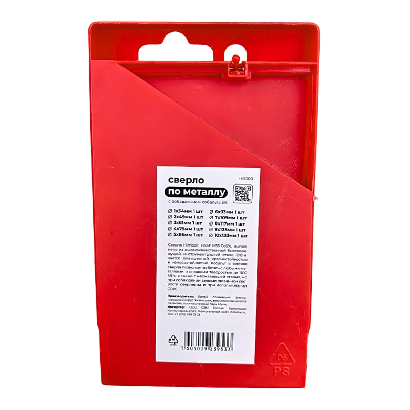Набор сверл по металлу с кобальтом 5% P6M5K5 1-2-3-4-5-6-7-8-9-10 мм HIMBOLT 10 шт.пласт.бокс выполнен из высококачественной быстрорежущей инструментальной стали. Отличается повышенной красностойкостью и износостокойстью. Кобальт в составе сверла позволяет работать с любыми металлами и сплавами твердостью до 1100 МРА, а также с нержавеющей сталью, но при соблюдении рекомендованной скорости сверления и при использовании СОЖ.