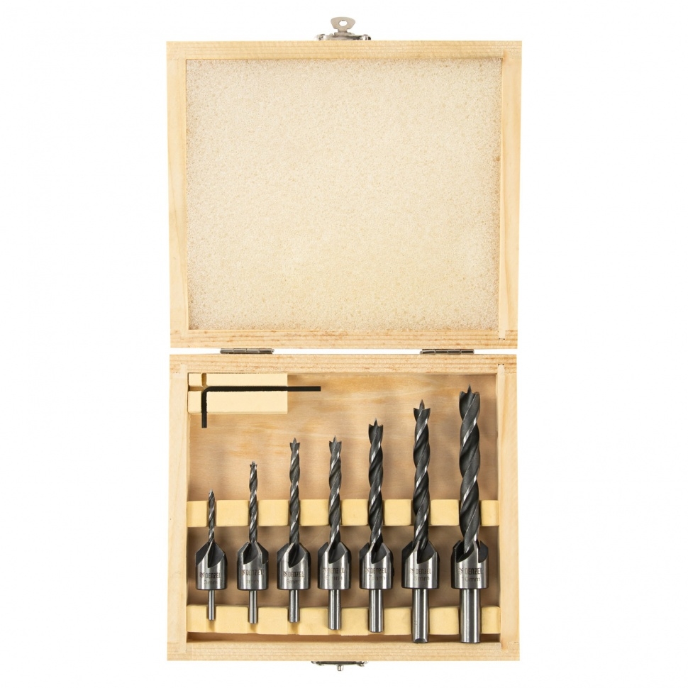 Коррозионная стойкость — оксидированное покрытие защищает сверла от ржавчины. Высокое качество работ — благодаря дополнительным резцам отверстия получаются ровными и чистыми. Быстрый поиск нужной оснастки — на каждое сверло нанесена маркировка, соответствующая диаметру отверстия. Цилиндрический хвостовик — сверла совместимы со стандартными патронами дрелей. Удобное хранение и транспортировка — набор поставляется в надежном деревянном кейсе.