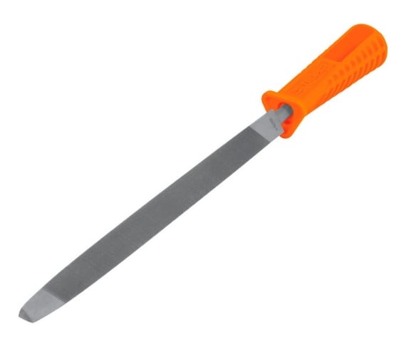 Напильник треугольного сечения из инструментальной стали. Угол заточки 60°. Полипропиленовая ручка.