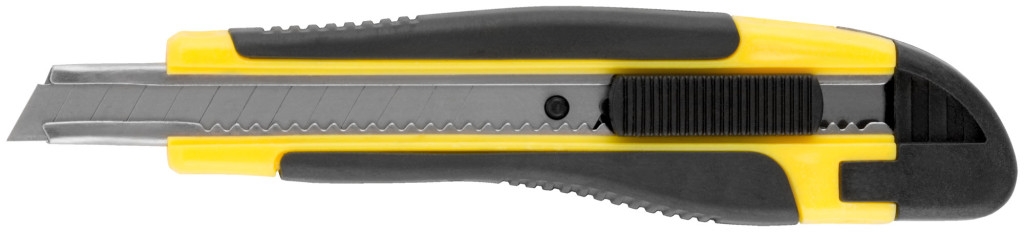 Нож технический 9 мм усиленный, «отламывающееся» лезвие с пластиковым прижимом. Материал: прорезиненный пластиковый корпус, усиленный металлической направляющей, лезвие из высокоуглеродистой стали. Упаковка: блистер.