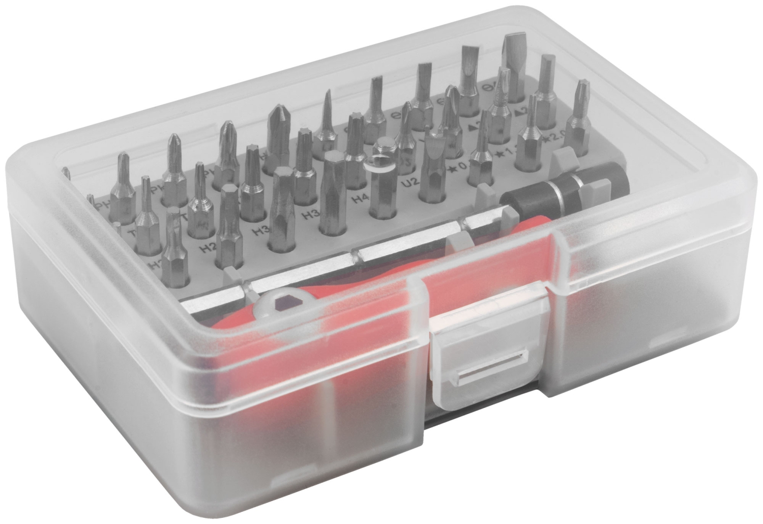 Биты 30 шт. PH000, PH00, PH0, PH1, PH2, SL1.5, SL2.0, SL2.5, SL3.0, SL4.0, T4, T5, T6, T8, T9, T10, Y-тип: Y2.0, Y3.0, треугольник 2.0, 2.3, H1.5, H2.0, H2.5, H3.0, H3.5, H4.0, U-тип: U2.3, пятилучевой Torx: 0.8, 1.2, 2.0, пластиковая ручка с металлическим фиксатором, удлинитель с магнитным фиксатором (L = 100 мм). Материал: удлинитель из инструментальной стали, биты из инструментальной стали (56174), биты из хром-ванадиевой стали (56175), ручка из пластика и алюминия. Упаковка: пластиковый кейс.