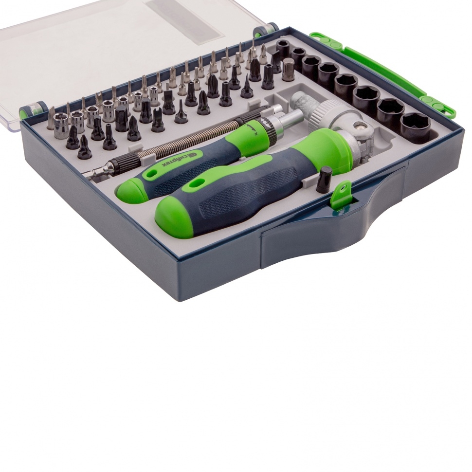 Биты: SL3, SL5, SL6, PH0, PH1, PH2, PZ2, T6, Т10, Т15, Т20, Т25, Т30, H4, H5, H6, SP4, TW 2,3 . 61 предмет из стали CrV, — это универсальные инструменты для частных и профессиональных мастеров. Отвертка с поворотной головой позволяет осуществлять монтаж/демонтаж крепежа в труднодоступных местах, а отвертка для точных работ пригодится при ремонте техники и приборов с микровинтами. Насадки из хромованадиевой стали обладают высоким ресурсом и износостойкостью, поэтому рассчитаны на интенсивную эксплуатацию. Реверсивный механизм повышает удобство эксплуатации, позволяя работать одной рукой. Обе отвертки оснащены двухкомпонентными рукоятками, посредством чего обеспечивается надежный хват без проскальзывания инструмента. Набор удобно брать на выездные работы, т.к. он продается в пластиковом кейсе с ручкой для транспортировки.