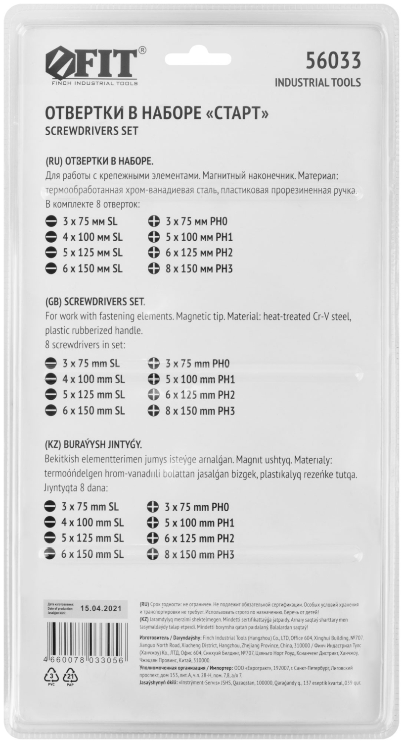 «Старт». SL3 x 75 мм, SL4 х 100 мм, SL5 х 125 мм, SL6x150 мм, PH0 x 75 мм, PH1 x 100 мм, PH2x125 мм, PH3x 150 мм. Материал: жало из хром-ванадиевой стали, магнитный наконечник, пластиковая прорезиненная ручка. Упаковка: двойной блистер.