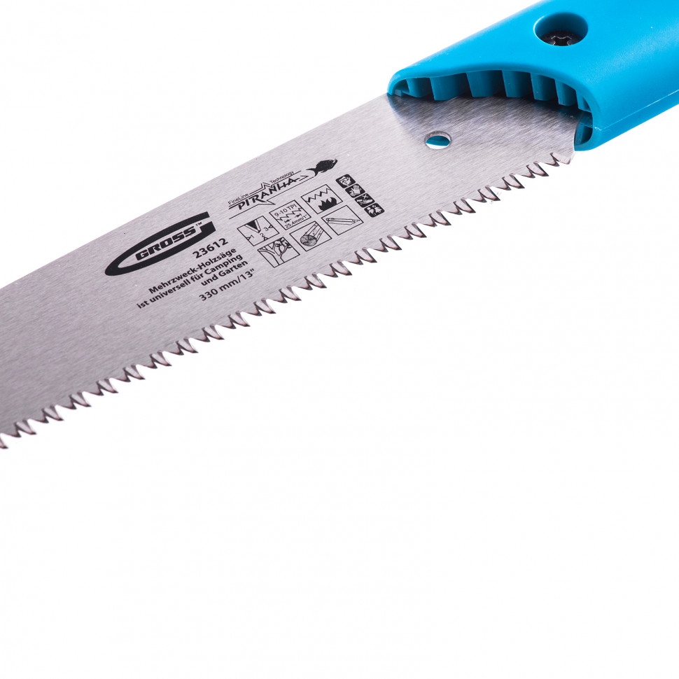 Универсальная пила по дереву Gross PIRANHA 23612 с полотном длиной 330 мм, калеными зубьями с шагом 9-10 TPI и 3D-заточкой, с 2-компонентной рукояткой, используется во время работ в саду и кемпинге. С ее помощью можно обрезать сучья или заготовить материал для растопки. Также пила подходит для распиловки фанеры, ДВП, ПВХ. Выполняет продольный и поперечный распил. Зубья с шагом 9-10 TPI и трехгранной заточкой обеспечивают высокую производительность инструмента. Благодаря заточке зубьев характеристики режущей кромки соответствуют всем международным стандартам. Пила комплектуется пластиковым пеналом, что исключает риск получения травмы во время хранения или транспортировки инструмента. Полотно из высококачественной японской стали SK-5 твердостью 48-52 HRC характеризуется прочностью и износостойкостью.