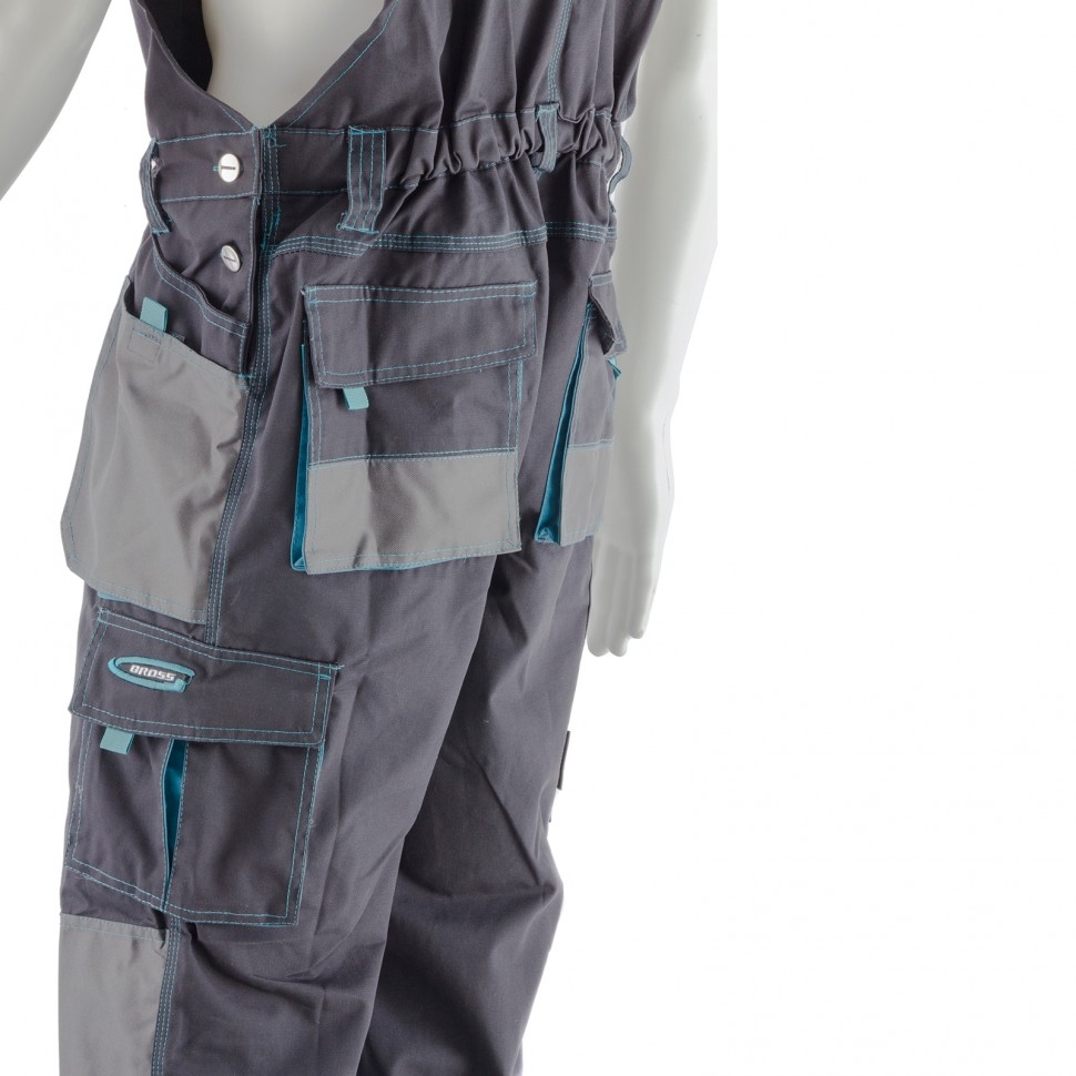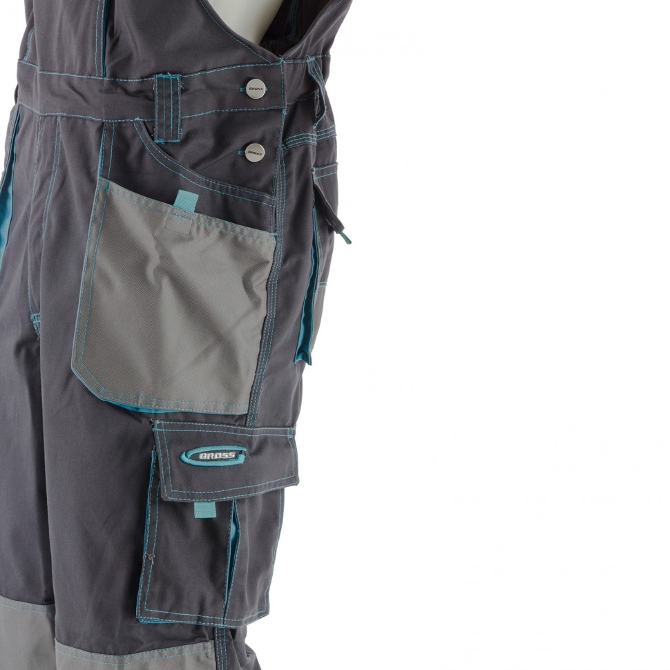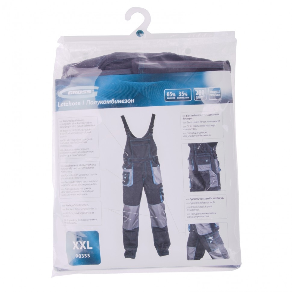 Полукомбинезон Gross 90355 размера XXL рассчитан на рост 188-191 см и предназначен для защиты рабочего от механических повреждений, ветра и пыли. Может применяться в отапливаемых помещениях или на улице в теплое время года. Изготовлен из смесовой ткани с 35%-м содержанием хлопка, которая не препятствует воздухообмену, поэтому в полукомбинезоне комфортно работать. На 65% ткань состоит из полиэстера, что обеспечивает износостойкость спецодежды. В 14 карманах можно разместить инструменты и необходимые мелочи. Полукомбинезон необходим строителям, электрикам, садовникам, сотрудникам автосервисов, а также рабочим других специальностей. Эластичный пояс комфортно прилегает к телу, не сковывая движений. Имеются карманы на липучках, поэтому мобильный телефон и другие мелкие предметы не потеряются. Специальные нашивки с водоотталкивающей пропиткой защищают боковые карманы от истирания, продлевая срок службы полукомбинезона. На коленной части предусмотрены карманы для амортизационных вкладышей.