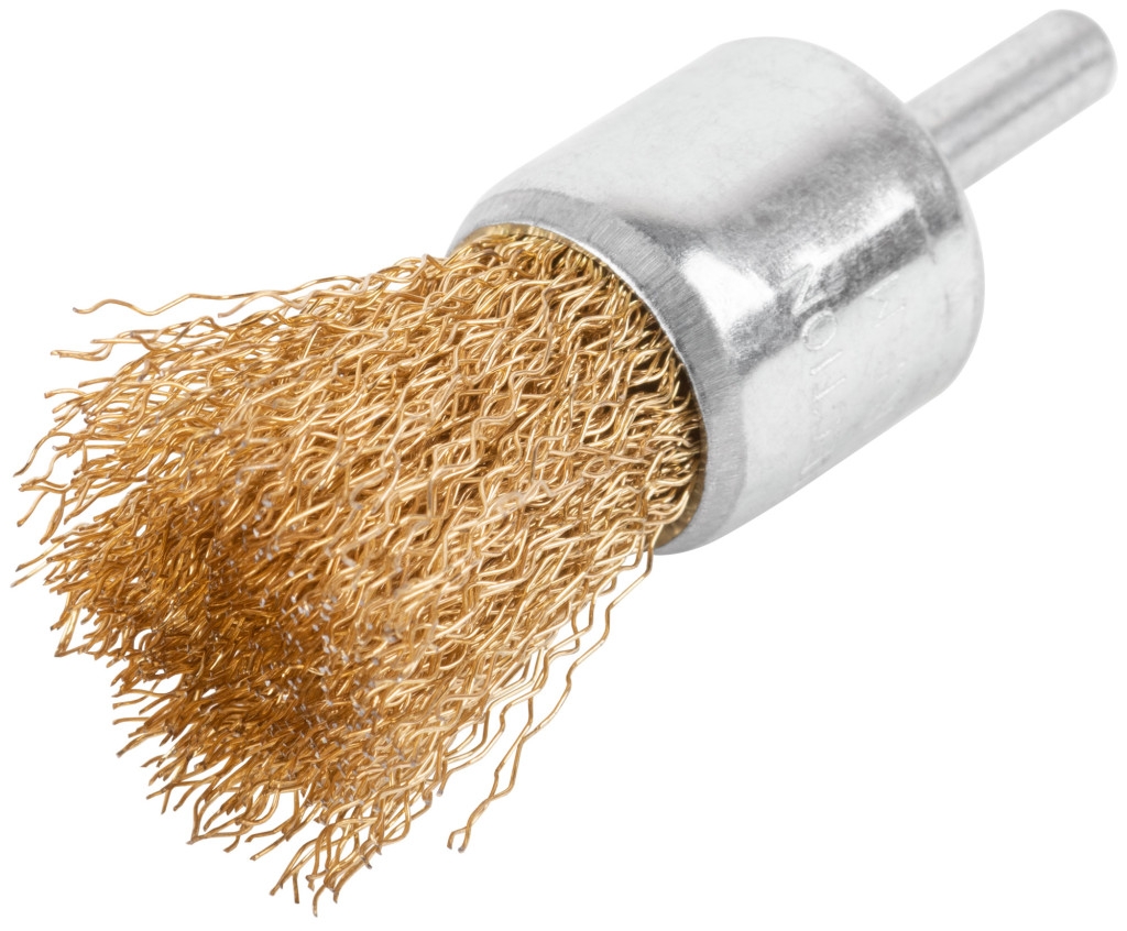 Щетка для дрели, форма «Кистеобразная» со шпилькой, 25 мм, витая латунированная проволока 0,3 мм. Предназначена для мягкой качественной зачистки различных металлических и деревянных поверхностей, снятия ржавчины, удаления лакокрасочных покрытий и других загрязнений. Отлично подходит для обработки больших плоскостей. Такая форма оптимально подходит для обработки углов, пазов, изгибов и других труднодоступных участков.