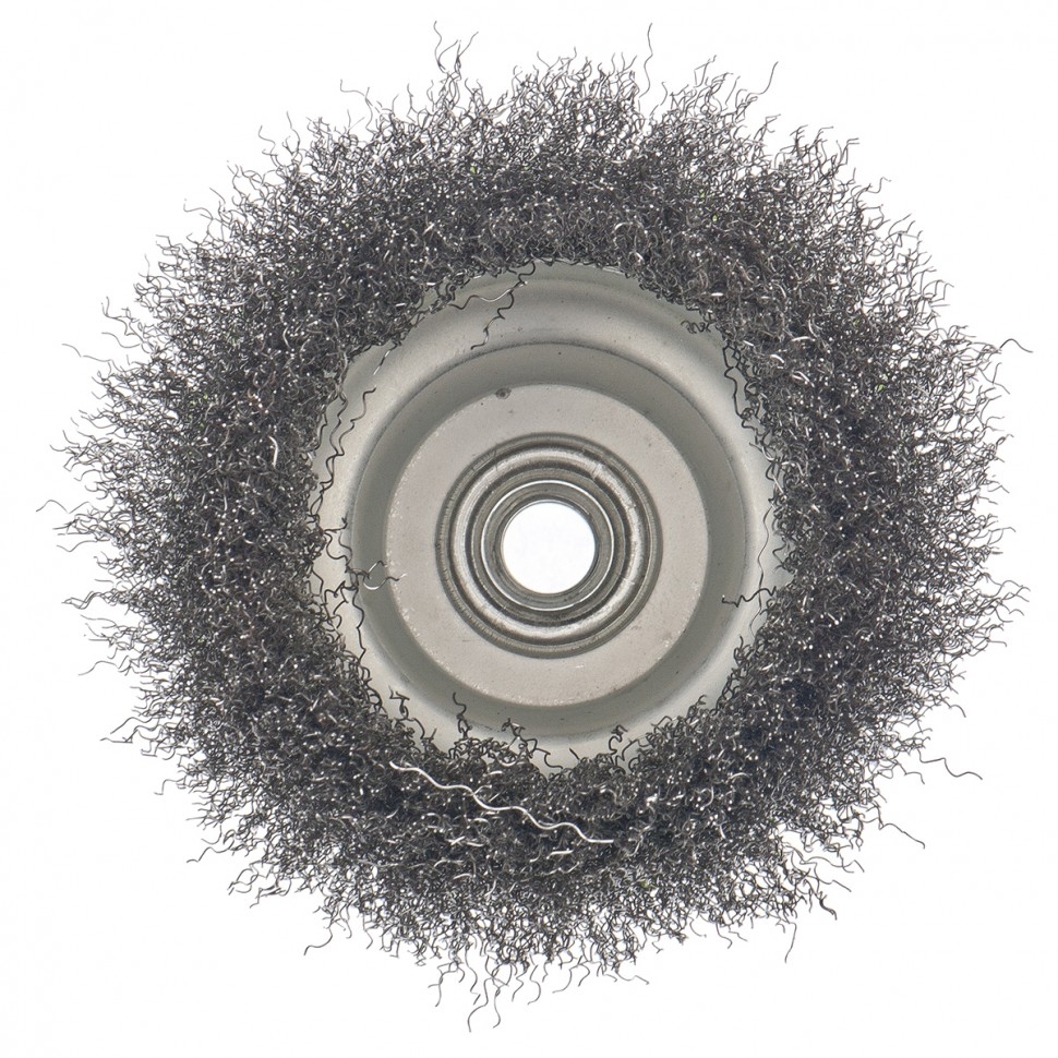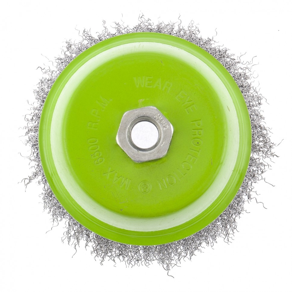 Щетка для УШМ Сибртех «чашка» 746067, М14, диаметром 125 мм, с щетиной из витой проволоки 0,3 мм, предназначена для постепенного снятия тонкого слоя материала с металлических, деревянных и пластиковых поверхностей. Удаляет ржавчину, загрязнения, а также остатки краски и других покрытий. Подходит для обработки участков значительной площади. Щетку устанавливают на вал углошлифовальной машины (УШМ), рекомендуемая максимальная скорость вращения 6500 об/мин. Работать с оснасткой следует в спецодежде. Преимущества Деформационная стойкость щетины — витая проволока принимает исходную форму после снятия нагрузок. Защита от коррозии — корпус покрыт эмалью, а на щетину нанесено техническое масло. Быстрая установка и замена насадки — щетка крепится на вал УШМ при помощи гайки М14.