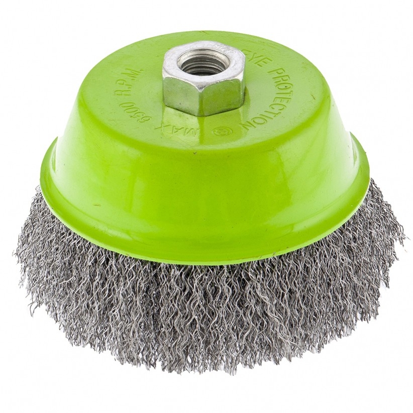 Щетка для УШМ Сибртех «чашка» 746037, М14, диаметром 65 мм, с щетиной из витой проволоки 0,3 мм, предназначена для постепенного снятия тонкого слоя материала с металлических, деревянных и пластиковых поверхностей. Удаляет ржавчину, загрязнения, а также остатки краски и других покрытий. Подходит для обработки участков значительной площади. Щетку устанавливают на вал углошлифовальной машины (УШМ), рекомендуемая максимальная скорость вращения 6500 об/мин. Работать с оснасткой следует в спецодежде. Преимущества Деформационная стойкость щетины — витая проволока принимает исходную форму после снятия нагрузок. Защита от коррозии — корпус покрыт эмалью, а на щетину нанесено техническое масло. Быстрая установка и замена насадки — щетка крепится на вал УШМ при помощи гайки М14.