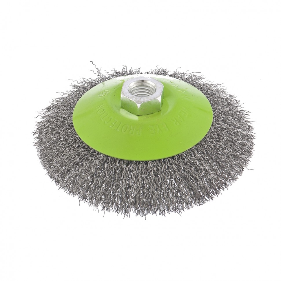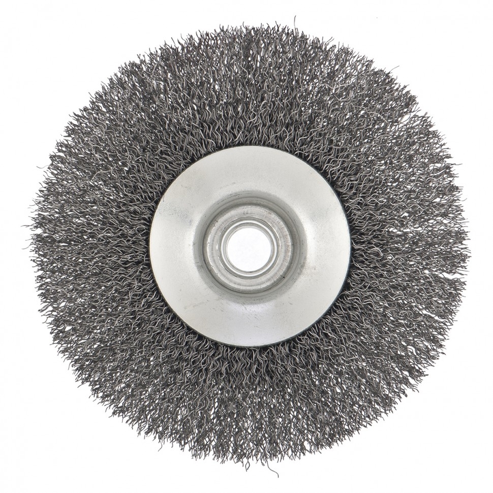 Щетка для УШМ «Тарелка» Сибртех 746167, М14, 125 мм, с щетиной из витой проволоки толщиной 0,3 мм, применяется для очистки металлических, деревянных и пластиковых поверхностей от ржавчины, старых лакокрасочных покрытий и загрязнений. Очищает как плоскости, так и труднодоступные места, поэтому оптимальна для обработки изделий сложной формы. Подходит для придания материалу шероховатости и матовости. Щетка устанавливается на вал углошлифовальной машины и выдерживает вращение со скоростью до 12500 об/мин, что обеспечивает высокую производительность оснастки. Во время работы следует использовать средства индивидуальной защиты. Щетка пригодится для проведения ремонта и решения бытовых задач. Преимущества Деформационная стойкость щетины — витая проволока принимает исходную форму после снятия нагрузок. Защита от коррозии — корпус покрыт эмалью, а на щетину нанесено техническое масло. Быстрая установка и замена насадки — щетка крепится на вал УШМ при помощи гайки М14.