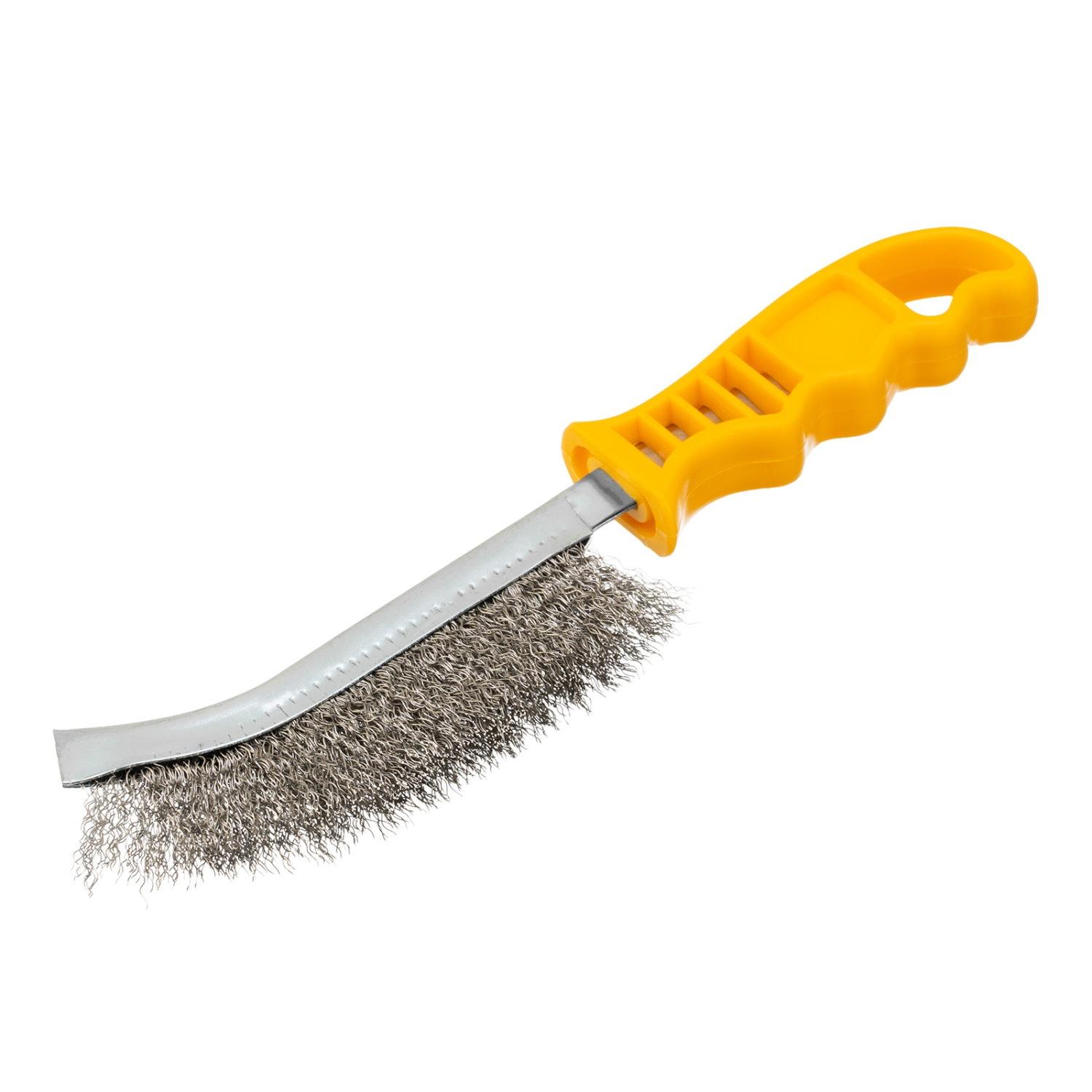 Щетка Denzel металлическая с пластмассовой ручкой, нержавеющая проволока 748287 используется для очищения металлических, деревянных и других поверхностей от ржавчины, загрязнений, остатков лакокрасочных покрытий. Щетина из нержавейки с высокой абразивной способностью обеспечивает эффективность щетки. Благодаря изогнутому корпусу щетки ей удобно обрабатывать поверхности со сложным рельефом. Инструмент пригодится во время строительства, кузовного ремонта, а также на производстве и в быту.