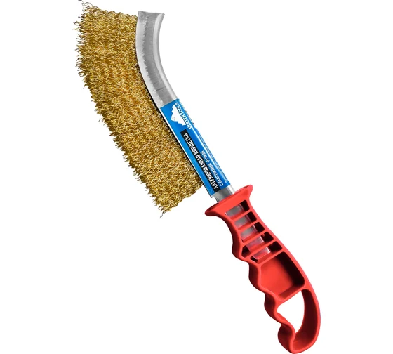 Она состоит из металлического корпуса и стальной латунированной рифленой проволоки. Пластмассовая рукоятка щетки имеет рифленую поверхность, что облегчает ее захват. Эргономичная пластиковая рукоятка;