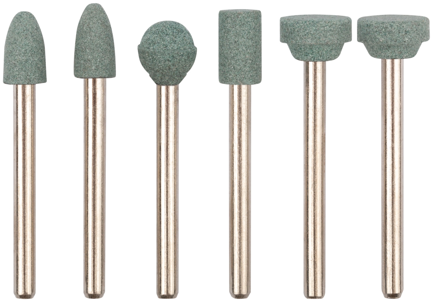 Для гравировальной машины. В наборе 6 шт. Предназначены для шлифовки изделий из камня, мрамора и стекла. Зернистость: P120. D хвостовика=3,1 мм. Материал: хвостовик из инструментальной стали, карбид кремния. Упаковка: блистер.