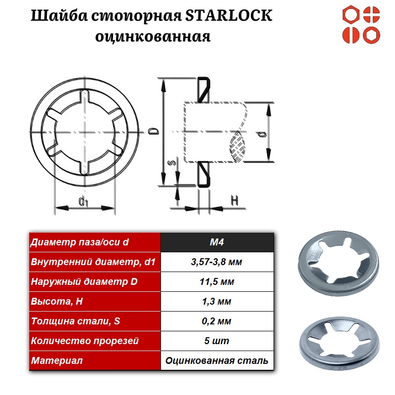Стопорная шайба Star-Lock М4 – представляет собой особое крепёжное изделие для быстрого, эффективного и надежного соединения элементов на валах из пластика и металла. Она монтируется простым надеванием на вал, при этом её внутренние зубцы гарантируют моментальное усилие захвата и фиксации. Изделие StarLock для крепления на валу производится из высококачественной стали с оцинкованным покрытием.