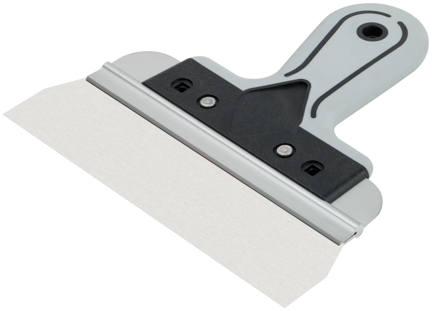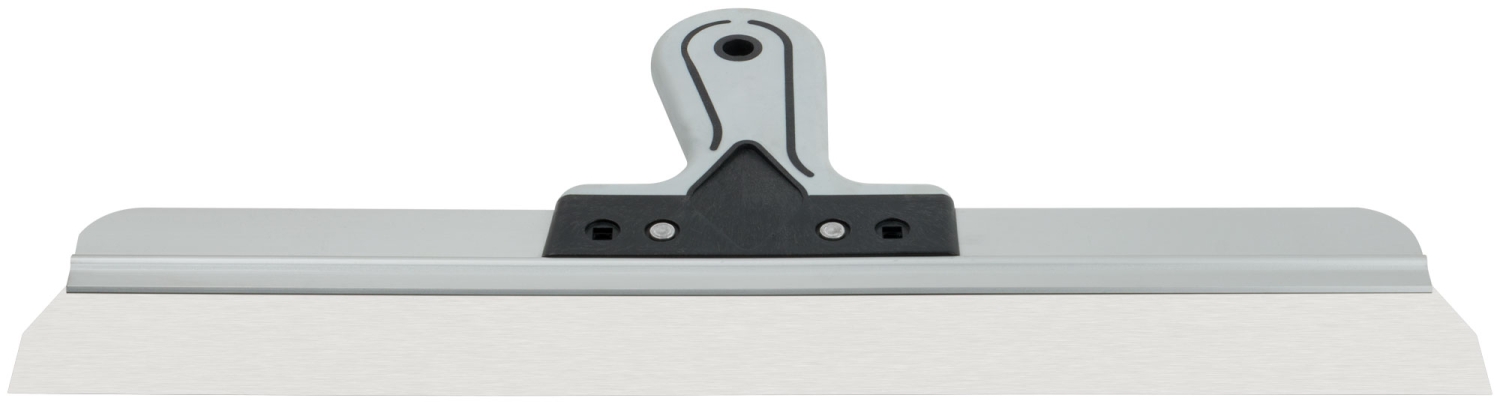 Профи. Для работы на поверхностях большой площади. Материал: лезвие из нержавеющей стали, алюминиевое ребро жесткости, пластиковая прорезиненная ручка.