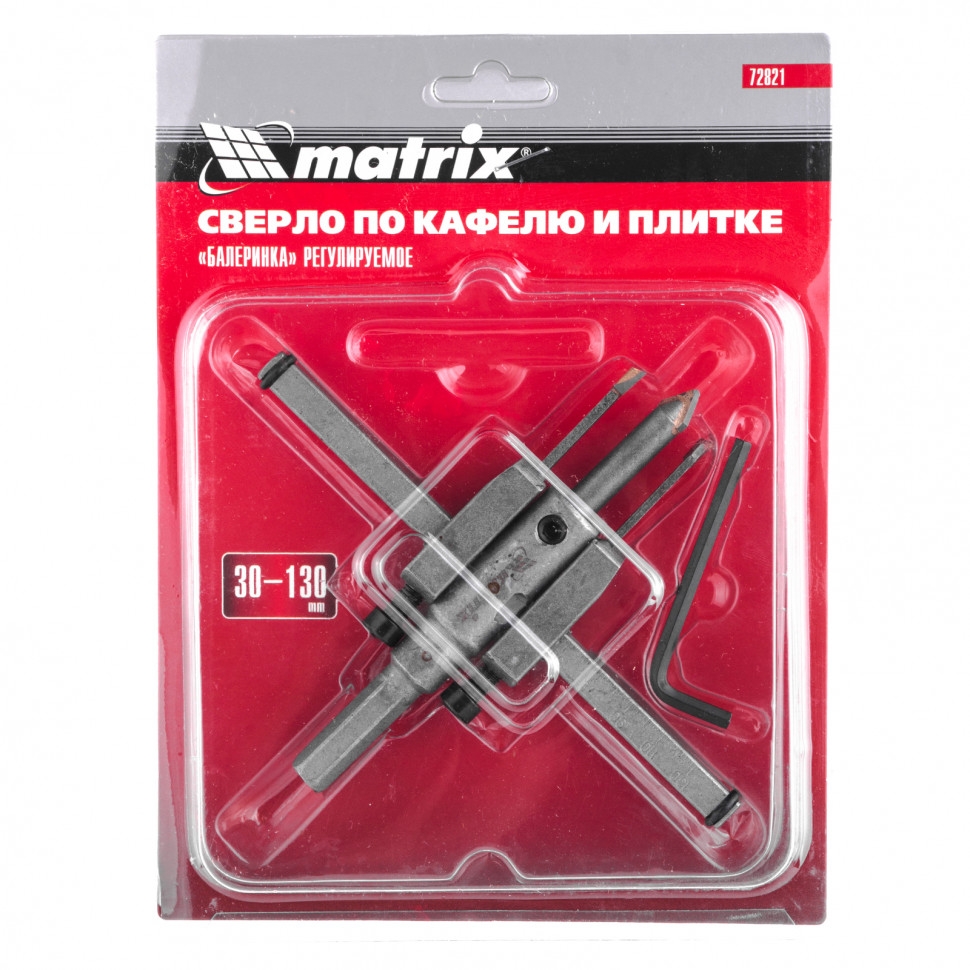Сверло Matrix «Балеринка» 72821, регулируемое в диапазоне 30-130 мм, рассчитано на получение отверстий в материалах толщиной 4-12 мм: керамике, кафеле, кирпиче, плитке и т.д. Оно используется в качестве оснастки на дрелях. Простая, но в то же время надежная конструкция сверла позволяет использовать его как начинающим мастерам, так и профессионалам. Сталь 45 выступает залогом высоких эксплуатационных характеристик сверла.За счет режущих кромок с твердосплавными пластинами ВК8 обеспечивается эффективный и ровный рез материалов. Шестигранный хвостовик позволяет надежно зафиксировать сверло в патроне, что исключает риск его прокручивания.Для удобства работы предусмотрена возможность быстрой регулировки диаметра реза.