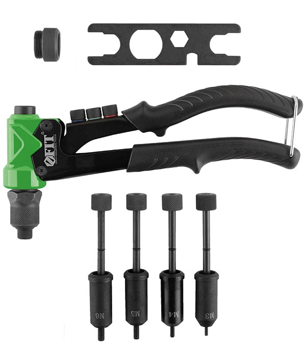 Заклепочник комбинированный Профи для резьбовых заклепок М3-М6 и вытяжных заклепок 2,4-4,8 мм для скрепления листовых материалов с помощью вытяжных и резьбовых заклепок из алюминия, стали и нержавеющей стали. Усиленная конструкция. Литой корпус. 4 быстросменных насадки для вытяжных заклепок, 4 насадки для резьбовых заклепок и ключ для смены насадок в комплекте. Материал: корпус из алюминиевого сплава, ручки из инструментальной стали с ПВХ накладками, насадки для вытяжных заклепок из инструментальной стали, насадки для резьбовых заклепок из хром-молибденовой стали. Упаковка: картонная коробка.